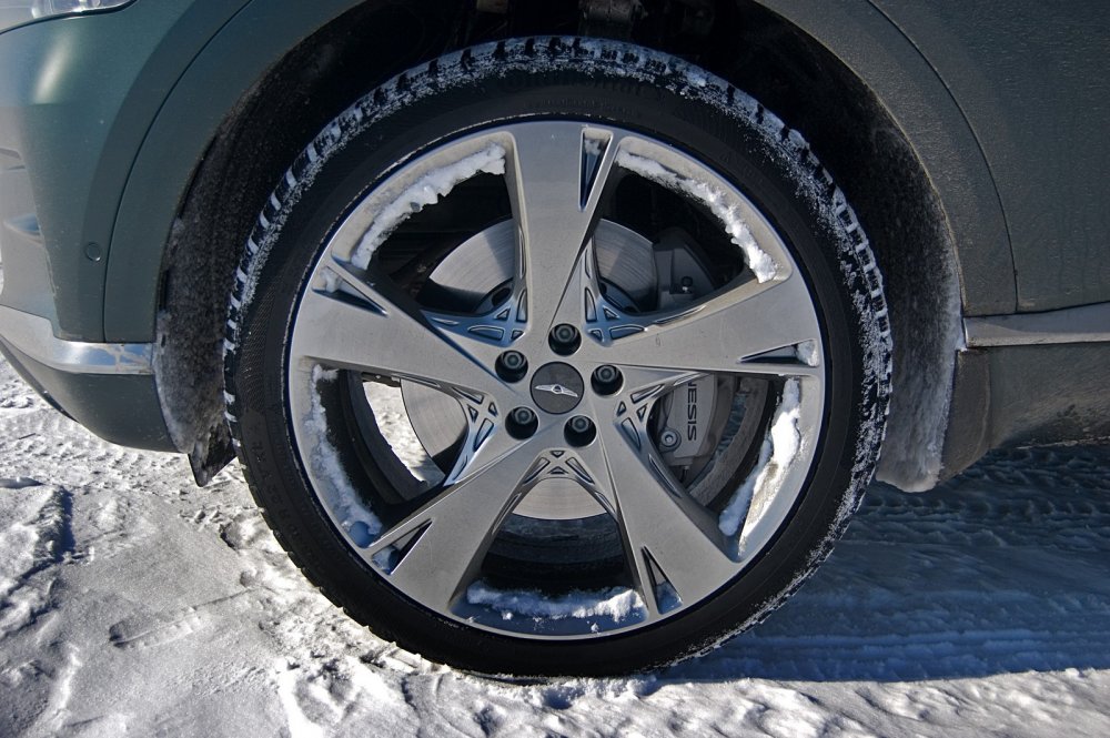 Так же, как и в случае с седаном G80, в России не будет возможности купить машину с маленькими колёсными дисками – у нас доступны диски только на 20 и 22 дюйма. Причина та же: передние тормозные механизмы кроссовера четырёхпоршневые, а в маленький диск они не помещаются (в Корее с дисками меньшего размера стоят суппорты с плавающей скобой). С одной стороны, большие диски – это красиво, с другой, есть небольшие сложности. Первая – это неизбежная установка низкопрофильных шин, а со второй сложностью мы столкнулись как раз на льду Байкала: шины на наших машинах стояли без шипов, «липучки». Любителям шипов придётся немного помучиться с поиском шиповок размером 22 дюйма. Эта такая цена красоты. Ну и надо отметить, что к работе тормозов претензий нет вообще никаких – их машине хватает.