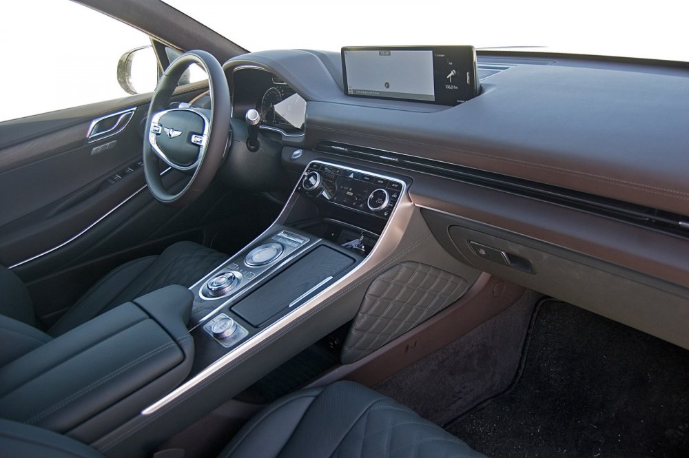 Интересно, в вариантах исполнения салона тоже есть комбинация с зелёным цветом (тёмно-зелёный сочетается с коричневым). Всего вариантов салона пять: зелёно-коричневый, чёрный, бежевый с чёрным, бежевый с коричневым и песочный с синим. И так же, как и у G80, есть несколько вариантов материалов отделки с использованием искусственной или натуральной кожи.