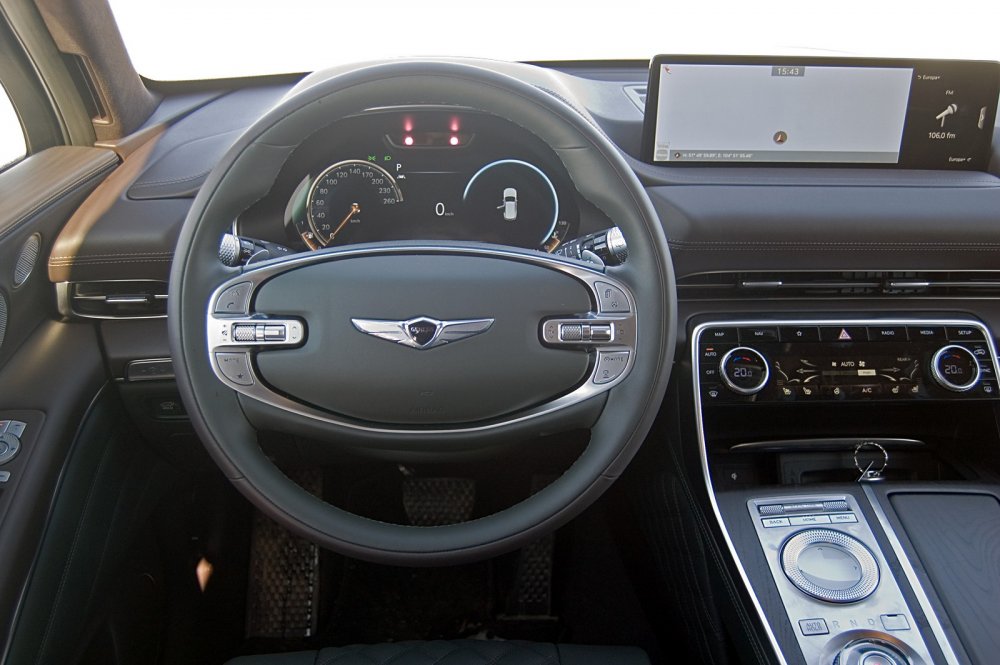Конечно, внутри GV80 очень похож на G80. Тут стоит та же самая 12,3-дюймовая опциональная трёхмерная цифровая приборная панель, тот же 14,5-дюймовый сенсорный дисплей с разрешением 2560х720, то же очень приятное рулевое колесо, тот же блок климата, те же прекрасные узкие дефлекторы… Но в кроссовере появилась «парящая» панель (и опять мы про такое уже слышали, не так ли?) с небольшой полочкой под ней между водительским и пассажирским креслами. Скажу сразу: пользоваться ей у меня не получилось – неудобно. Но зато красиво.