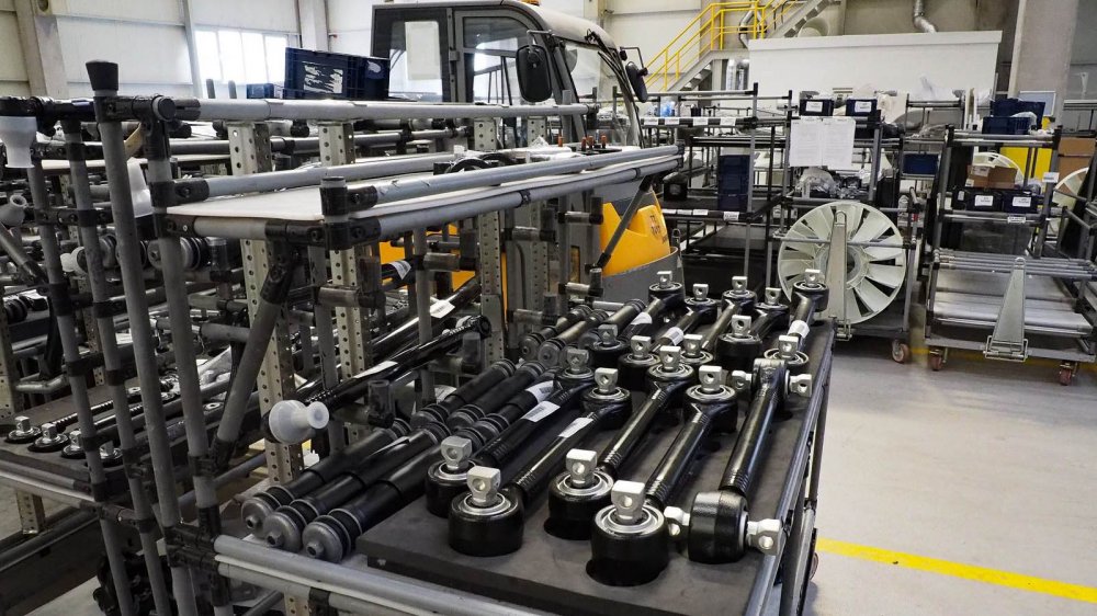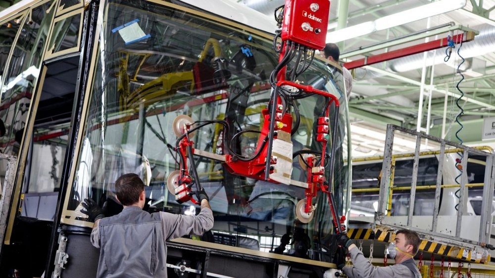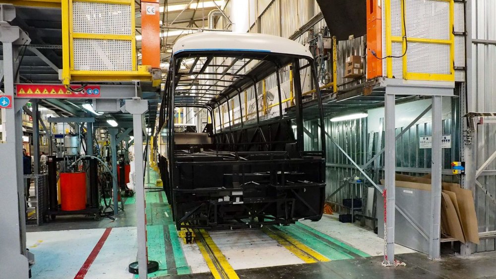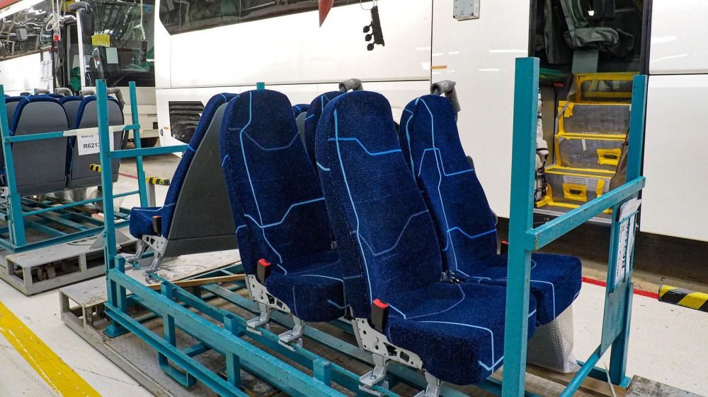 Прошлись мы и по этим участкам. Катафорезный цех оказался самым безлюдным, а здесь – много ручного и очень квалифицированного труда и никаких роботов. Правда, труд серьезно облегчают многочисленные средства малой механизации. Как, например, без них с ювелирной точностью вклеить огромное лобовое стекло туристического автобуса? И, естественно, монтаж интерьеров, электрического и электронного оборудования осуществляется исключительно вручную. А как иначе?