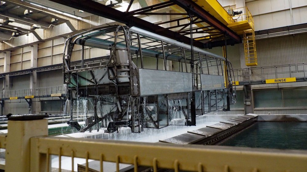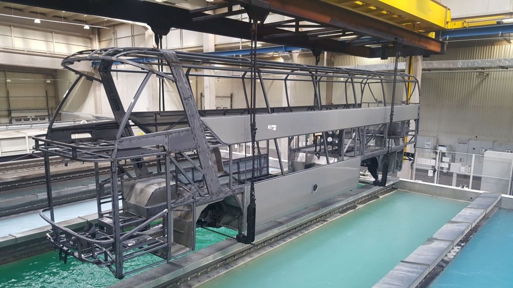 Надежная антикоррозионная защита несущей конструкции транспортного средства – залог его долголетия, а срок эксплуатации автобусов, особенно автобусов категории «люкс», достаточно долог. Поэтому катафорезная грунтовка, которая на порядок эффективнее оцинковки, и была выбрана в качестве такой меры защиты. Физический смысл процесса таков: деталь, на которую наносится грунт, помещается в ванну с раствором. К ней подключается анод, а к корпусу ванной – катод, который активирует растворенные частички грунта положительными зарядами. В результате электролитической реакции положительно заряженные частицы закрепляются на отрицательно заряженном металле. Естественно, перед этим с детали должна быть удалена оксидная пленка, и она должна быть обезжирена. Но представьте, что «деталь» – это каркас автобуса длиной 12-13 метров! И ванночки, в которых ее предстоит искупать, должны иметь соответствующие размеры, и заботливые руки, которые будут окунать деталь в эти ванночки, должны иметь соответствующую мощность. В общем, катафорезный цех представляет собой череду таких ванн, в которых каркас проходит обезжиривание, фосфатирование и непосредственно процесс катафорезной обработки. Ну а между ними расположены ванны, в которых осуществляется промывка. Наконец, обработанный каркас автобуса отправляется в сушильную камеру, на окраску и – на участки, где и происходит окончательная сборка.