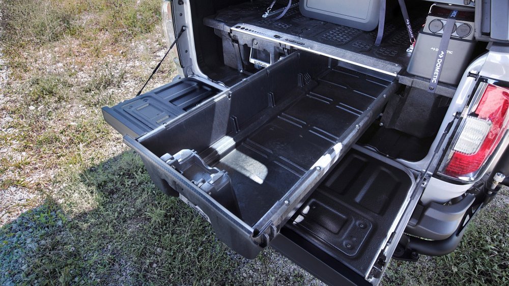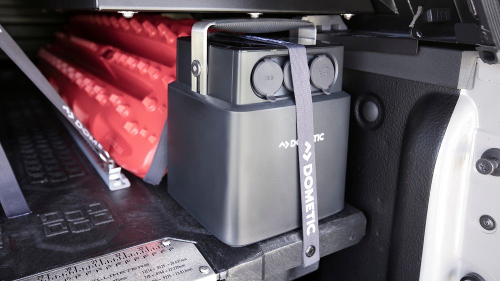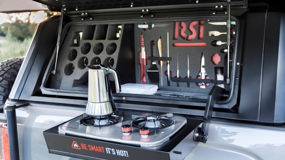 На грузовую часть кузова установлен кунг из нержавейки, а в нём и на нём — полный походный набор: мобильный пищеблок с газовой плитой и запасом питьевой воды, палатка, тент, стол, стулья, вещевой ящик-органайзер, солнечная панель для автономного электропитания, канистры с бензином, «лыжи» для подкладывания под колёса на случай застревания, тросы, домкраты и прочее спасательное оборудование.