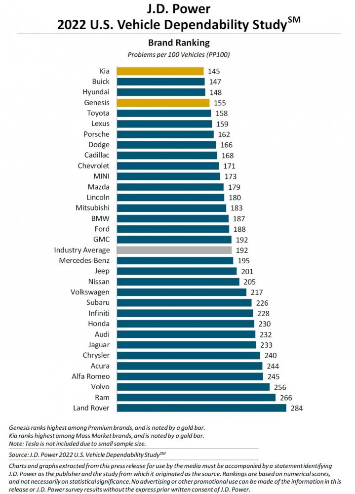 Как видно из диаграммы, меньше всего на проблемы жаловались американские владельцы автомобилей Kia — 145 проблем на 100 машин (145 PP100), на втором месте Buick (147 PP100), на третьем Hyundai (148 PP100), на четвёртом — самый надёжный премиальный бренд Genesis (155 PP100) и только на пятом — славящаяся своей надёжностью Toyota (158 PP100). Прошлогодний лидер Lexus спустился на шестую строчку (159 PP100).