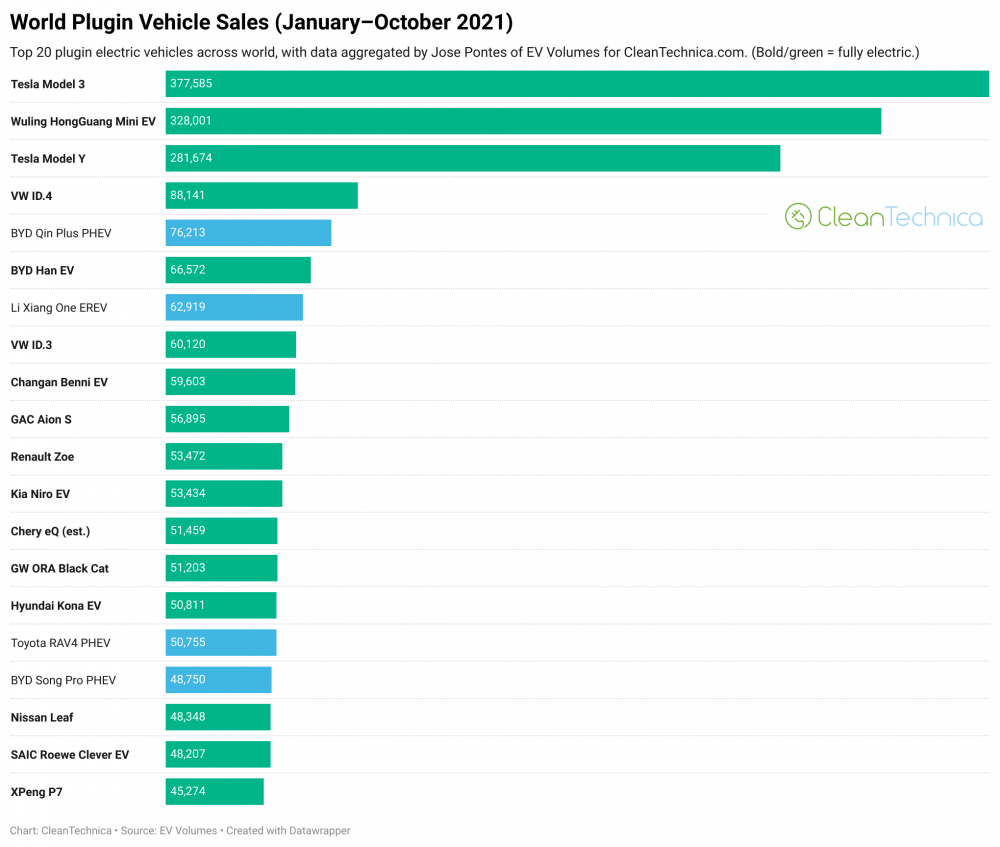 60 тысяч — это много это или мало? Ответить на этот вопрос нам поможет статистика продаж розеточных моделей (электромобилей и plug-in гибридов) по всему миру, собираемая ресурсом CleanTechnica. Данные с января по октябрь этого года показывают, что Ford Mustang Mach-E не вошёл в двадцатку самых востребованных моделей, при этом кроссовер Tesla Model Y разошёлся тиражом 281 674 шт., Volkswagen ID.4 — 88 141 шт.