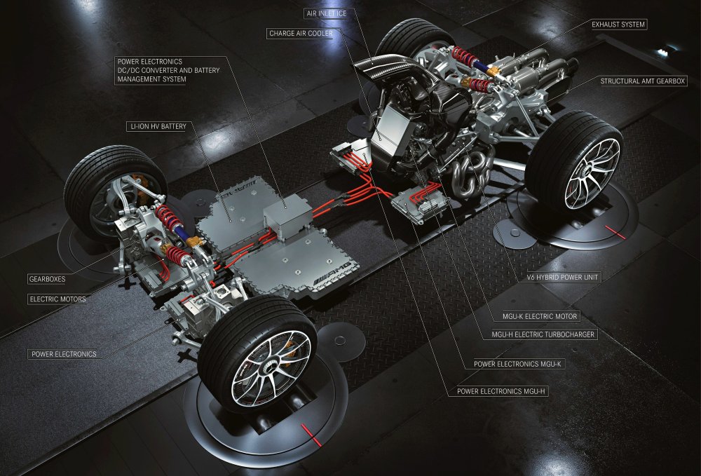 Задача адаптировать технологии Формулы-1 к машине, предназначенной для дорог общего пользования, оказалась чрезвычайно сложной. Например, двигатель V6, позаимствованный у болида 2016 года, должен был не только обеспечить приемлемый для дорожной машины ресурс, но и отвечать актуальным экологическим нормам Евро 6, ради чего его пришлось буквально окутать «банками» катализаторов и снабдить их мощной системой предварительного прогрева.