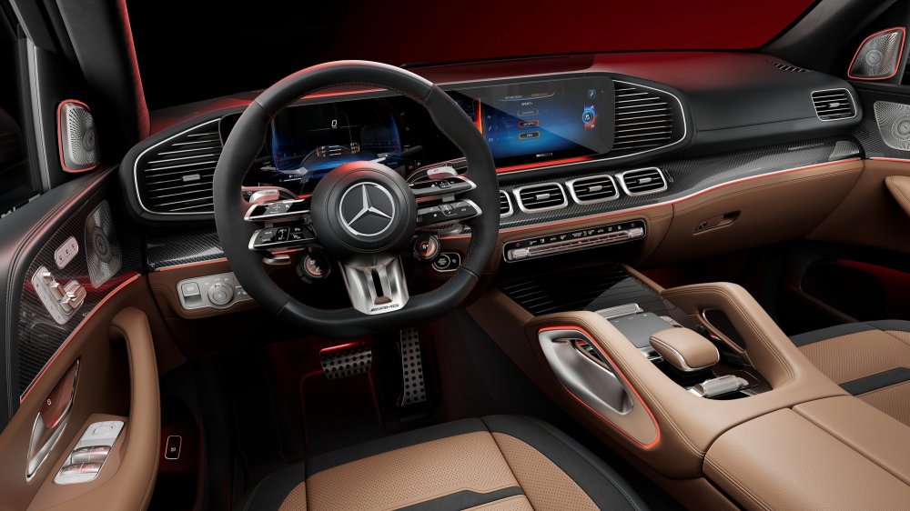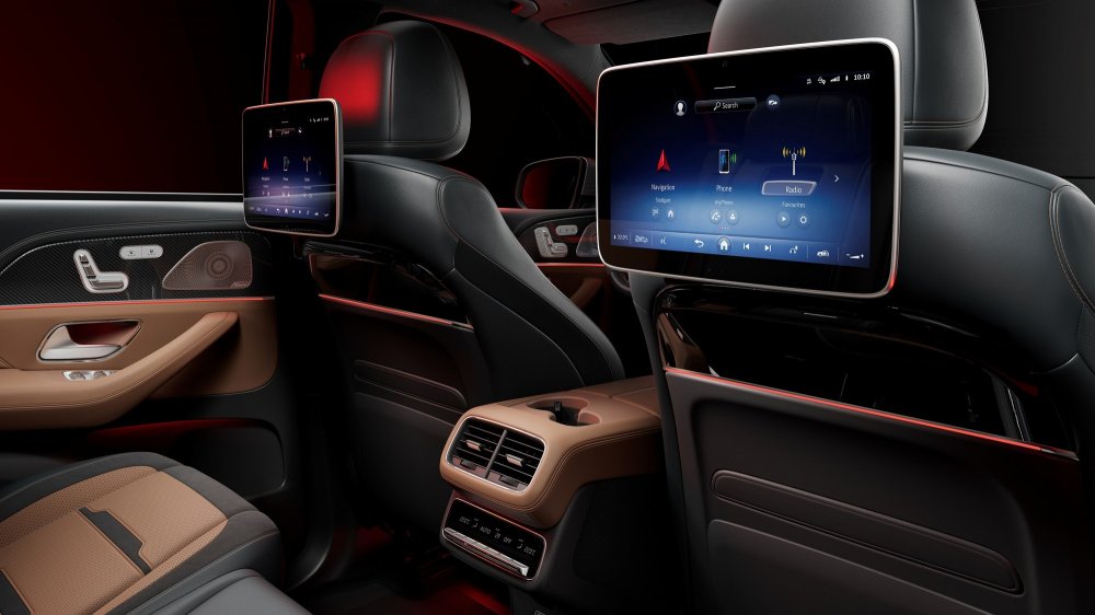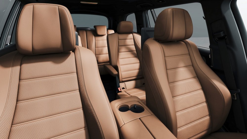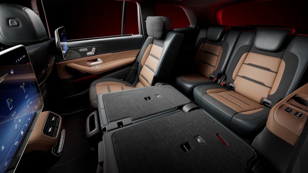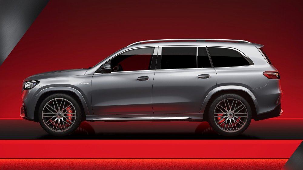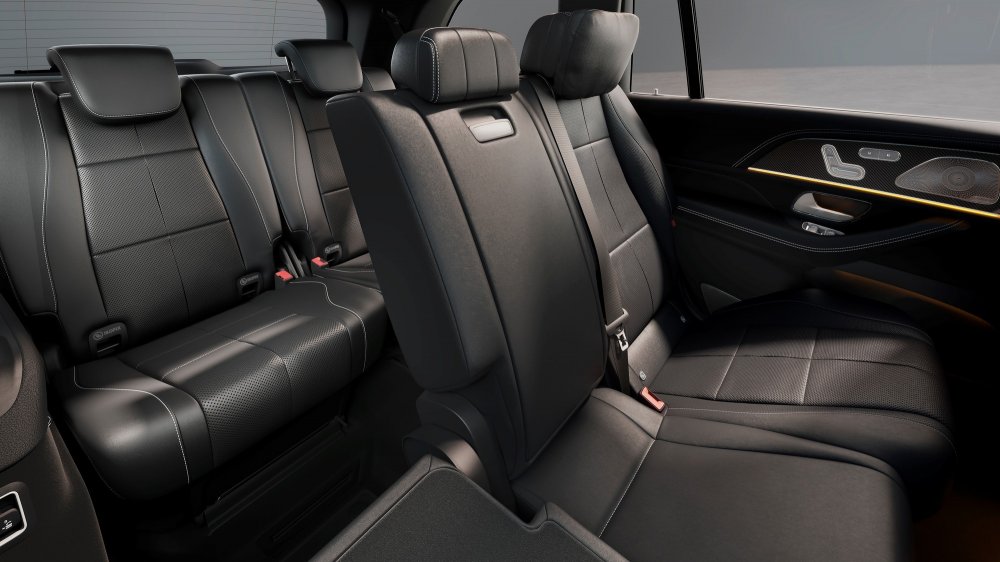 У всех «дежурных» версий и у спортивного Mercedes-AMG GLS 63 салон 7-местный. Версия AMG внешне почти не изменилась, у неё прежние передний бампер и радиаторная решётка с вертикальными прутьями, но появились новые задние фонари и новый колёсные диски, а место эмблемы Mercedes-Benz на капоте заняла эмблема AMG.