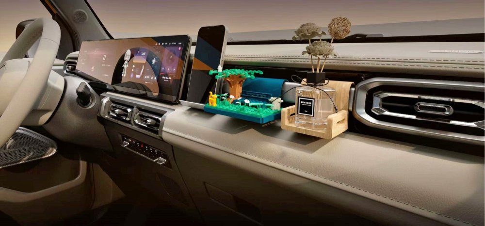 Приборный и мультимедийный экраны (оба 10,25-дюймовые) объединены в общее табло, справа от него есть «рельс», к которому можно прикрепить держатель для смартфона, игрушку и ароматизатор воздуха. Для прочих мелочей и личных вещей есть бардачок, ниши в дверях, крючки и небольшой передний багажник.