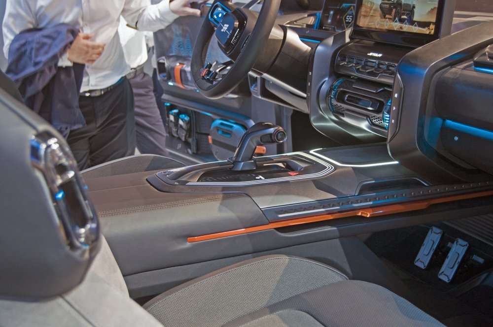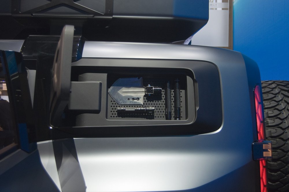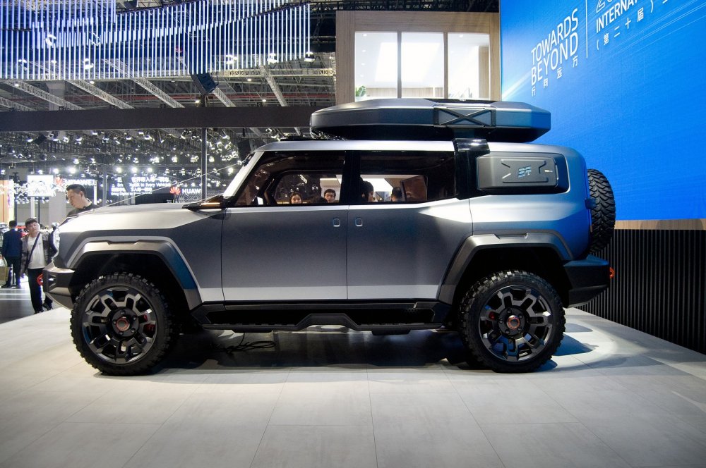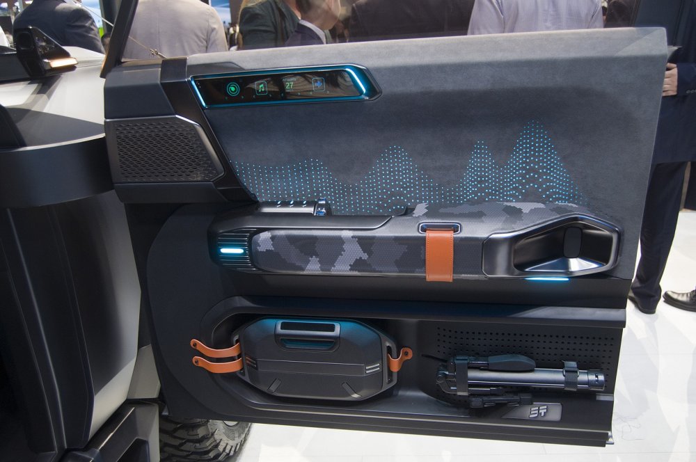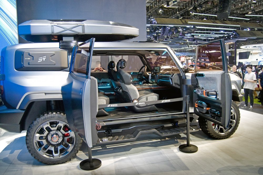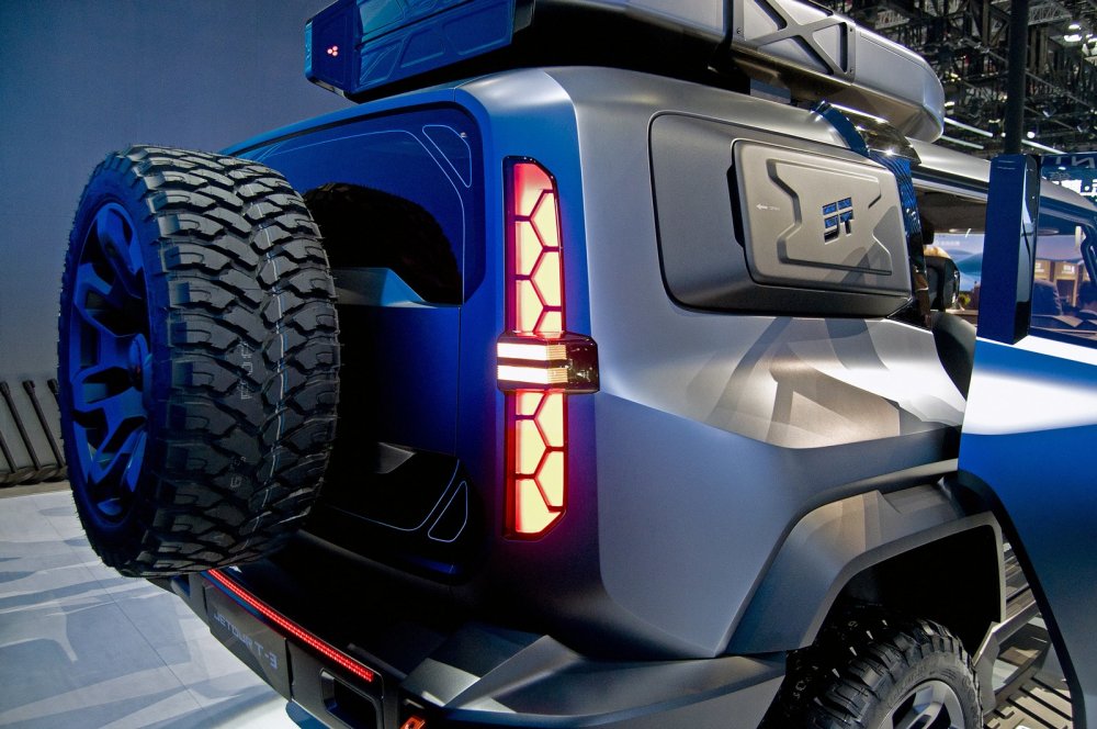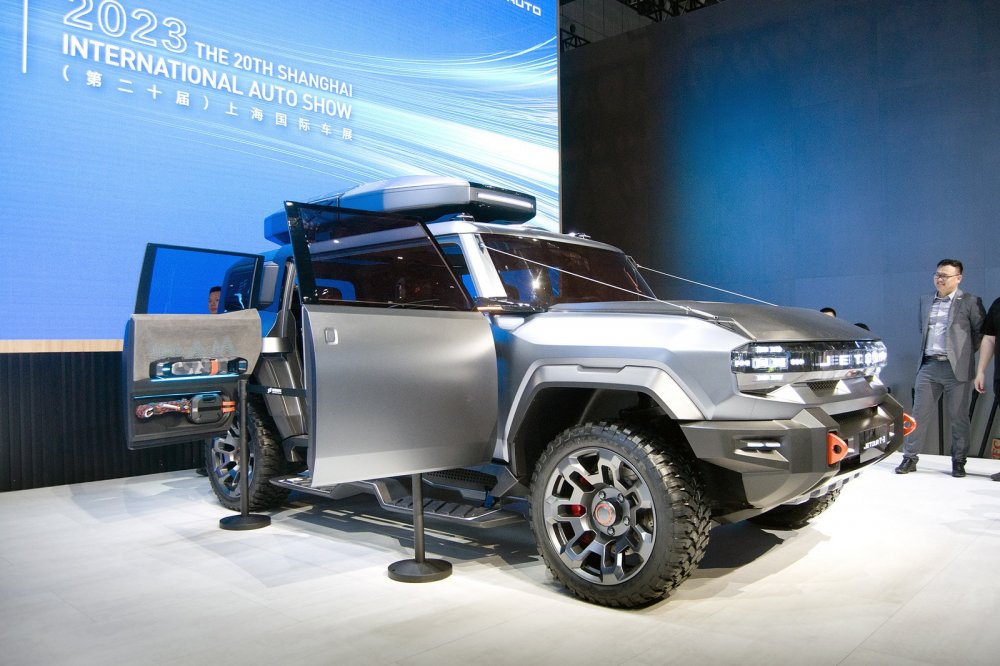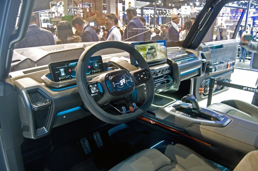 Чтобы подчеркнуть суровую сущность внедорожника, его презентация началась под не менее суровый китайский рэп. А когда артисты отошли в сторону, перед нами предстало это чудо с распашными дверьми. Куда там до него какой-то Toyota FJ Cruiser! Тут одни габариты поражают воображение: целых 5,3 метра в длину (вместе с запаской на задней двери), 2 метра в ширину и 1,9 метра в высоту при колёсной базе около 3 метров. Понятно, что многие детали тут бутафорские (всё-таки пока это концепт, а не серийный автомобиль), но не присмотреться к ним нельзя.