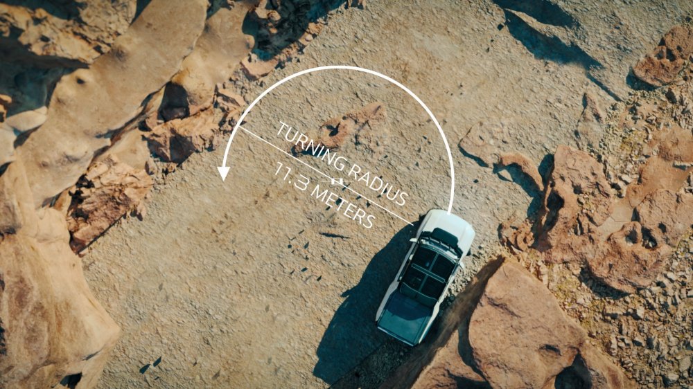Версия Edition One оснащена регулируемой в ручном либо автоматическом режиме пневмоподвеской. Дорожный просвет варьируется в диапазоне от 257 до 404 мм. Ход подвески (двойные поперечные рычаги «по кругу») — 330 мм. В верхнем положении кузова (то есть при клиренсе в 404 мм) угол въезда составляет 49,7 градуса, угол съезда — 38,4, угол рампы — 32,2 градуса, глубина преодолеваемого брода — 808 мм. При этом надо понимать, что в верхнем положении кузова ход подвески будет практически выбран, то есть ехать быстро в таком положении нельзя, но для покатушек по камням и косогорам, очень популярным в Америке, этого и не требуется — вся дистанция проходится «ползком». Для подобных трофи очень пригодится также функция регулировки давления шин из салона и 18 камер кругового обзора, две из которых расположены прямо под днищем (имеют защиту от повреждений и омыватели).