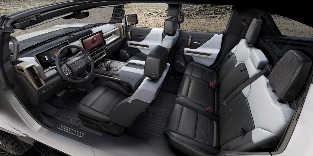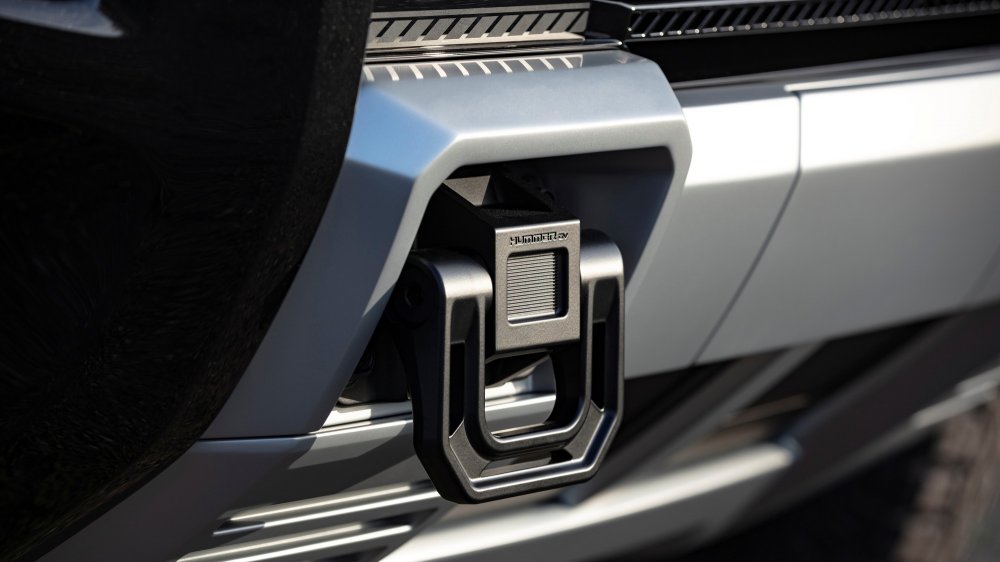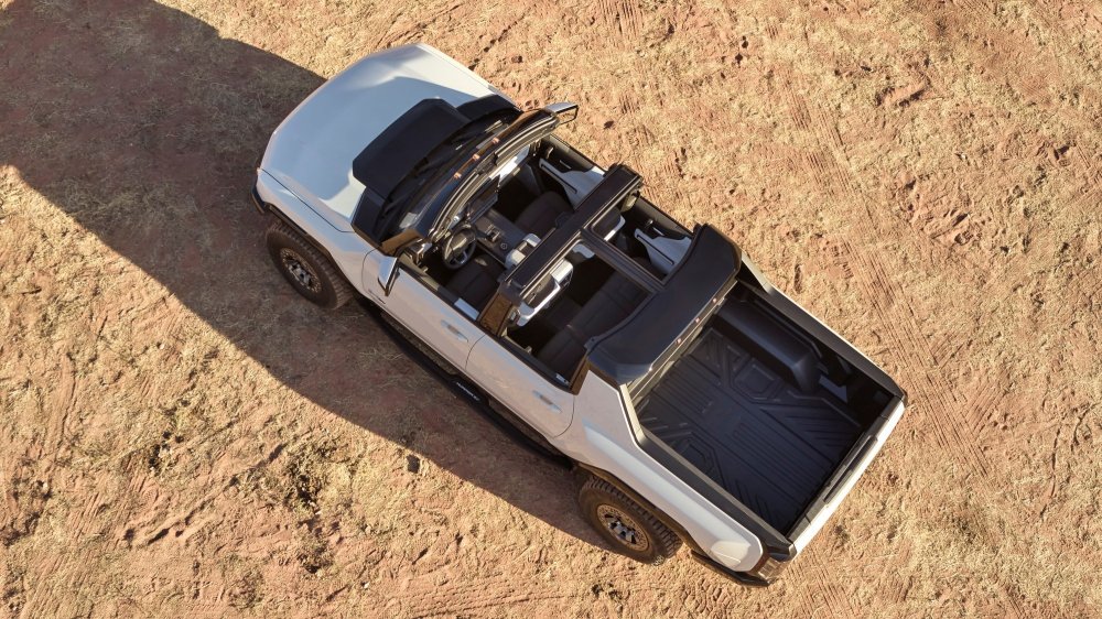Составной задний борт (его можно превратить в лесенку) и съёмные секции крыши (их можно сложить в передний багажник) — классные «фишки», но вот возможности снять двери, как у Ford Bronco, электрический Hummer не предлагает.