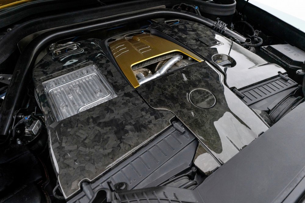 4,0-литровый бензиновый битурбомотор V8 (заводской индекс М177) под капотом Gronos Coupe EVO C форсирован с 585 л.с. и 850 Нм до 900 л.с. и 1200 Нм, время разгона с места до 100 км/ч сократилось с 4,5 до 3,3 с — это даже круче, чем у Brabus 900 Rocket Edition, который набирает первую «сотню» за 3,7 с. Углепластиковый обвес у «гелика» от Mansory не менее агрессивный, чем у Брабуса, на «купе» он подчёркнут необычным основным цветом кузова — градиентным Fludium с эффектом хрома и перламутра. Кроме того, на трёхдверке дебютировали новые 24-дюймовые колёсные диски FD.15, окрашенные в цвет кузова.