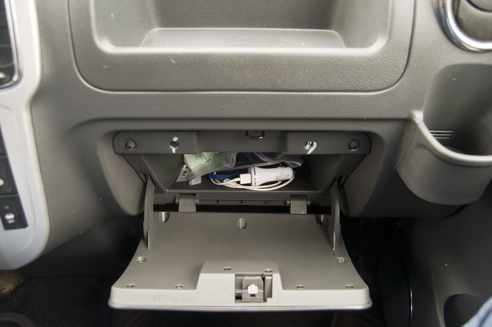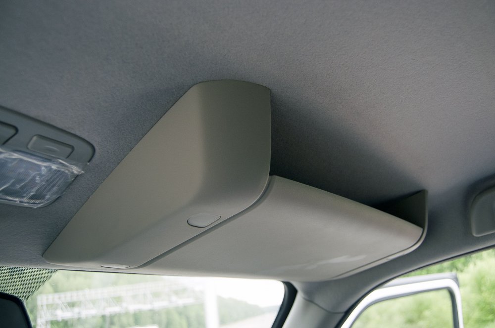 Кабина у Captain-T цельнометаллическая. Открываем дверь и смотрим, что тут с интерьером. А тут, надо признать, типично азиатский грузовичок. Он не плохой, но и не выдающийся. Впрочем, смысла ругаться на жёсткий пластик в кабине коммерческой машины нет – лишь бы не слишком быстро он изнашивался. А вот размер бардачка не радует: файл с документом А4 туда можно только запихнуть, а вот положить – нет, маловато места. Документы можно положить в органайзер на потолке перед передним пассажиром (кабина двухместная), но этот органайзер занял место противосолнечного козырька, так что решение тоже немного спорное.