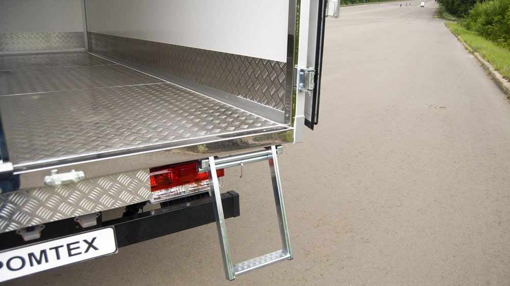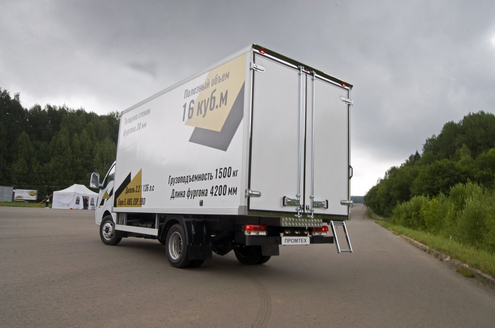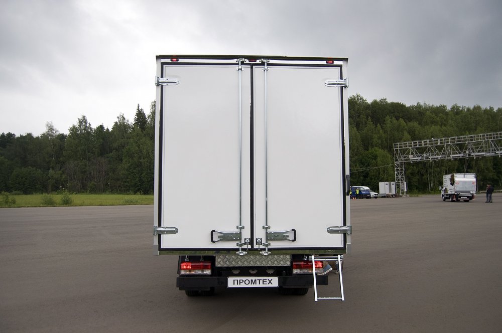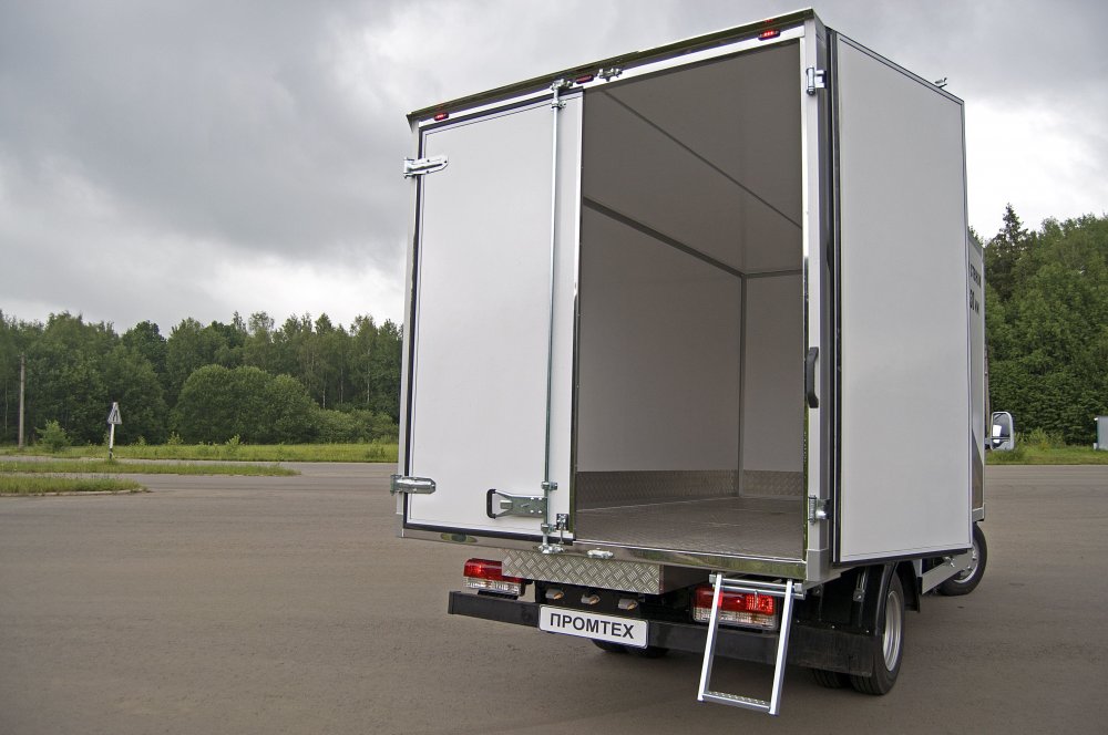 Объём нашего фургона – 4200х2000х2000 мм (16 кубических метров), а его стенки выполнены из сэндвич-панелей толщиной 30 мм. Загрузочная высота получилась небольшой благодаря маленьким колёсикам 185R15LT, а внутри его пол сделан из рифлёного алюминия. Получилось и симпатично, и практично. В общем-то, разглядывать один фургон слишком долго – занятие скучное, поэтому расскажем, какие ещё надстройки предлагает Промтех, кроме тех, что показал журналистам.