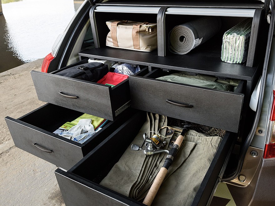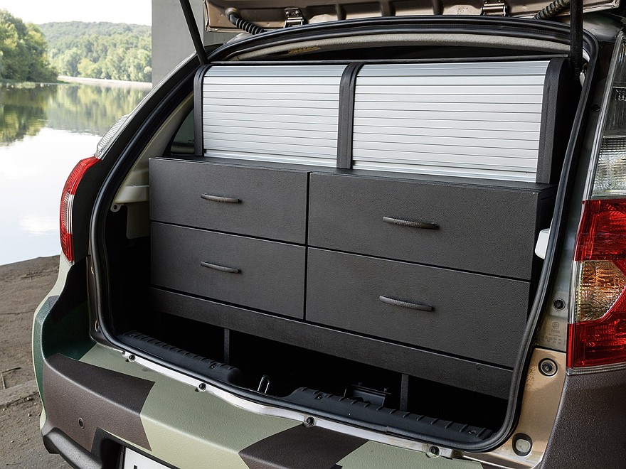 Масштабные изменения произошли в салоне. Заднего дивана у "экспериментального" mi-DO нет. Высвобожденное пространство было использовано для установки большого бокса с ящиками для хранения вещей и выдвижным столом. Автомобиль укомплектовали комплектом тросов, раскладным тентом, походными лопатами и топором, а также холодильником на 20 литров.