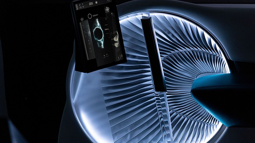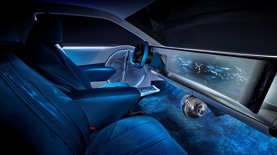 Свет в салоне — очень замысловатый, адаптивный, создающий интимную атмосферу, как в театральной ложе. Отделка сидений со складками тоже напоминает о театре. Складки — это не только элемент дизайна, но и задел на более отдалённое будущее, когда владельцам электромобилей DS станет доступно полностью автономное вождение и кресла можно будет удлинять и превращать в лежаки и кровати, для чего потребуется буквально растягивать обивку. Аудиосистема в DS M.i. 21 редуцирована до подвесной колонки под передней панелью, корпус колонки выполнен прозрачным, чтобы можно было видеть её изящную техническую начинку.