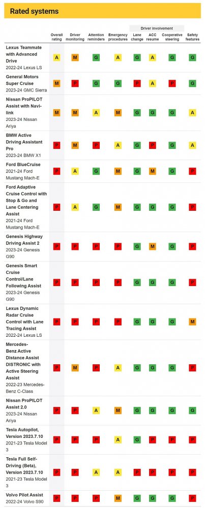 Хорошую итоговую оценку G не получила ни одна из 14 протестированных систем, приемлемую оценку А заслужила только система Lexus Teammate Advanced Drive на седане Lexus LS. Слабые оценки М получили системы General Motors Super Cruise на пикапе GMC Sierra и Nissan ProPilot Assist Navi-link на электрическом кроссовере Nissan Ariya. У остальных итоговый «неуд», что лишний раз подчёркивает, как далеко пока человечество от полностью автономного вождения.