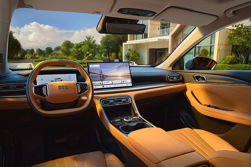 Внутри – двухспицевый руль, двухэтажный центральный тоннель и раздельные экраны приборки (10,2 дюйма) и мультимедийной системы (14,6 дюйма). Мультимедиа работает на операционке Flyme Auto. Привычного селектора коробки тут нет, за переключение передач отвечает подрулевой рычажок.