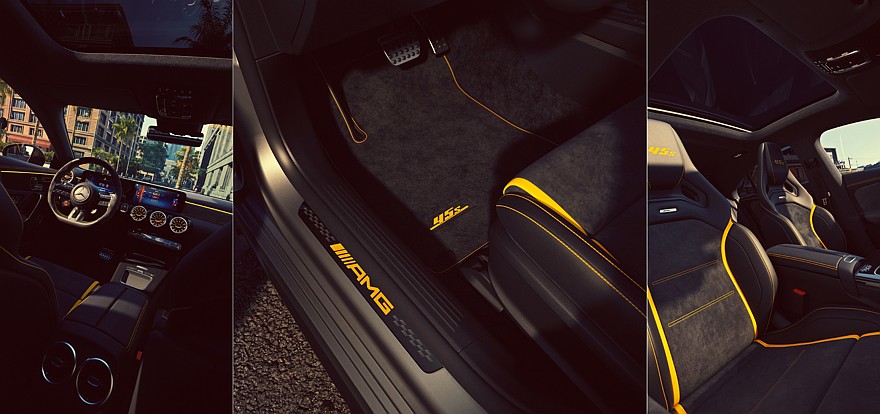 В салоне установлены кресла AMG Performance, они получили чёрную обивку MB-Tex и микрофиброй с ярко-жёлтыми вставками и аналогичной контрастной прострочкой, а на подголовниках имеется вышитая надпись с индексом модели – «45 S». Рулевое колесо отделано кожей наппа и микрофиброй с жёлтой прострочкой. Аналогичного цвета элементы присутствуют на дверных картах, напольных ковриках и порогах дверей.