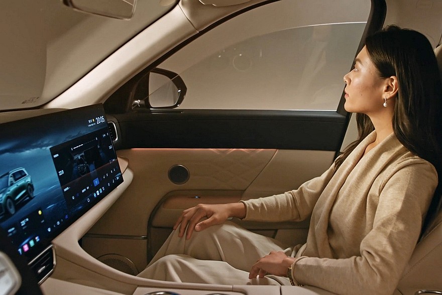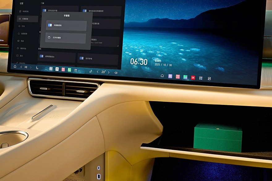 Chery Fulwin T11 строго шестиместный. Перед водителем установлен отдельный приборный экран на 10,25 дюйма, всю остальную площадь передней панели занял 30-дюймовый тачскрин с разрешением 6K. Мультимедиа – с искусственным интеллектом. На центральном тоннеле расположены две площадки для беспроводной зарядки, «хрустальные» шайба и кнопки, неприкрытые подстаканники (в том числе, и для задних седоков). Экраны и беспроводная зарядка идут уже в базе.