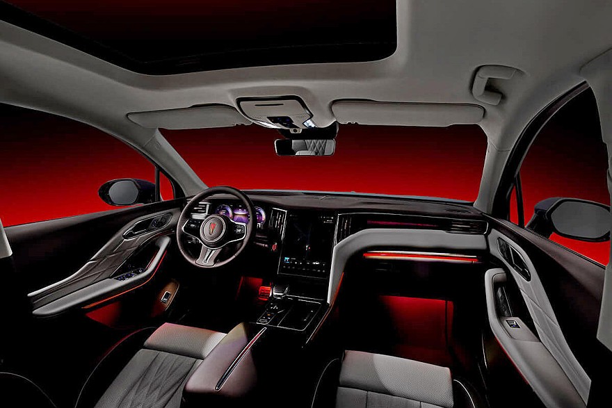 Внешность выполнена в актуальном фирменном стиле Hongqi. Кроссовер имеет внушительную радиаторную решетку с хромированными вертикальными плашками (плюс активные жалюзи) и двухэтажную головную оптику, задние фонари объединены между собой светящейся и блестящей полосками. Нашему Hongqi HS7 обещаны 20-дюймовые диски. В салоне – виртуальная приборка и мультимедиа с вертикальным планшетом. Российским клиентам Hongqi HS7 будет доступен в семиместном исполнении.