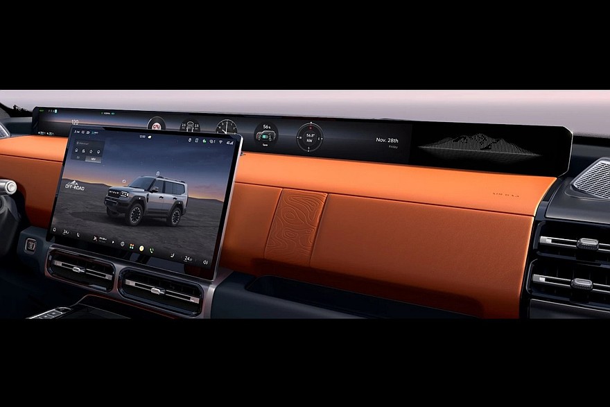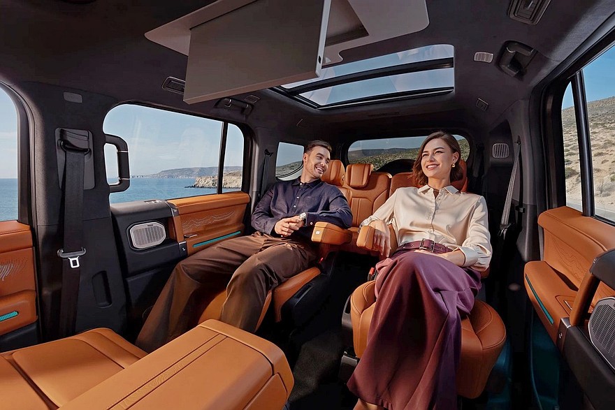 Как и в Китае, глобальный вездеход бывает пяти- или шестиместным. Внутри – выполняющий роль приборки узкий экран практически во всю ширину передней панели (35,4 дюйма) и тачскрин мультимедиа диагональю 15,6 дюйма. В зависимости от комплектации в списке оборудования Jetour G700 также значатся: адаптивная подвеска, подогрев, вентиляция и массажер кресел, отдельный экран для задних пассажиров (крепится к потолку), камеры кругового обзора, обычный или адаптивный круиз-контроль, системы автоторможения и удержания в полосе движения.