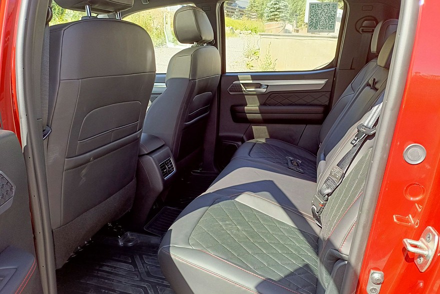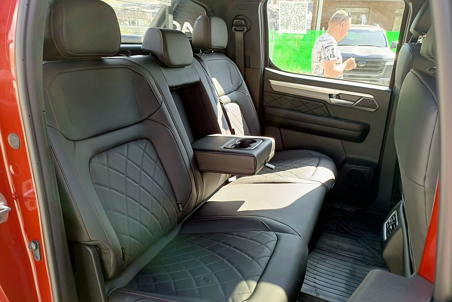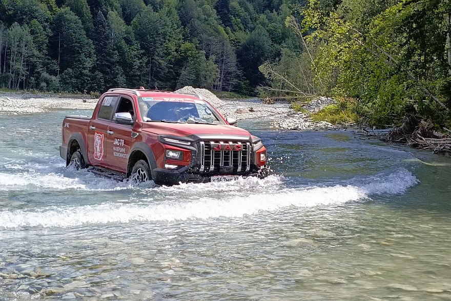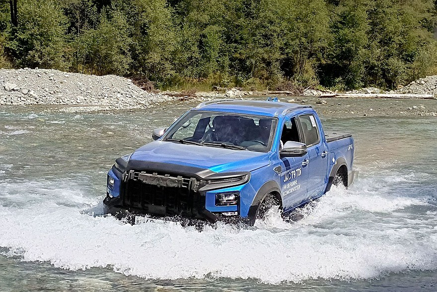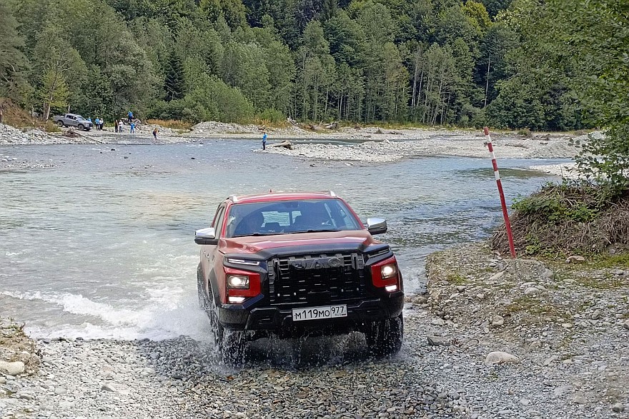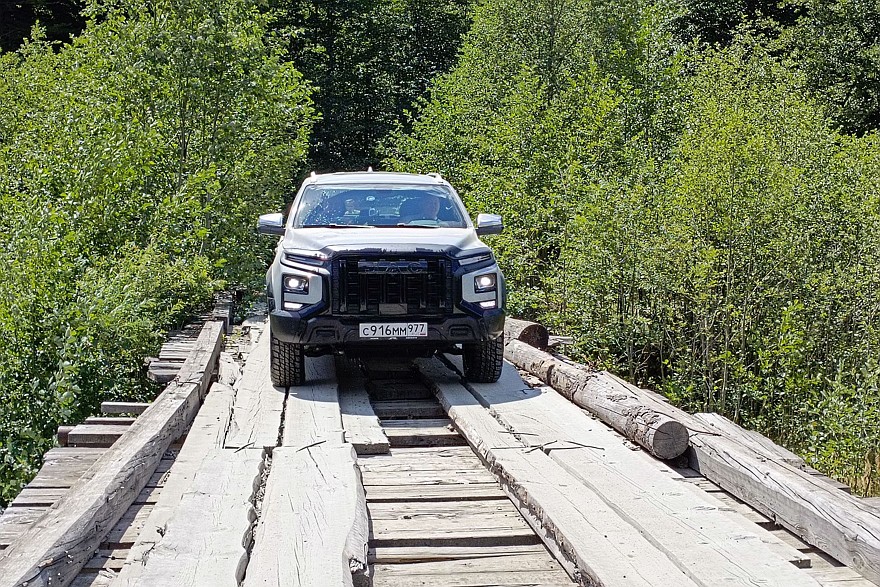 Тестировать автомобиль мы отправились на серпантины вблизи Архыза. Это идеальное место для того, чтобы испытать потенциал пикапа с явно внедорожными амбициями. Описывая размеры, мы не упомянули очень приличные свесы: 945 мм спереди и 1275 мм сзади. Удивительно, но они практически не мешали автомобилю на местных горных полудорогах-полупроселках чувствовать себя в своей тарелке. Лишь пару раз я где-то уперся, что-то боднул, но в остальном же «пролезаемость» у пикапа достойная. А ходы задней подвески чуть ли не в колесо так и не позволили вывесить машину диагонально: ни одного подходящего места для такого безобразия я не нашел.