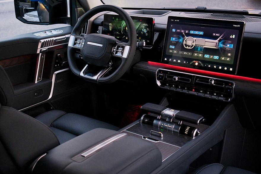Как и прежде, в РФ почти пятиметровый M-Hero I представлен в виде последовательного полноприводного гибрида с пневмоподвеской. Силовая установка версии Limited Edition включает работающий в режиме генератора бензиновый турбомотор 1.5 (163 л.с.) и два электродвигателя, которые вместе выдают 544 л.с. и 700 Нм. У топового варианта тот же ДВС и три электродвигателя (один спереди и два сзади), суммарная отдача системы такого вездехода – 816 л.с. и 1050 Нм. Кроме того, M-Hero I досталась батарея емкостью 42,9 кВт*ч, тогда как в старшей комплектации внедорожник имеет аккумулятор на 65,8 кВт*ч. Суммарная дальнобойность новой версии – 700 км по циклу WLTP (у топового вездехода – 750 км).