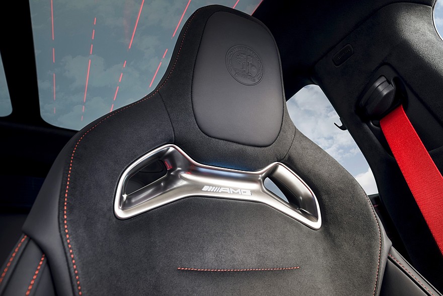 Задний диван может быть двух- либо трёхместным, но третьему, центральному пассажиру будет в любом случае неудобно из-за высокого центрального тоннеля. Задним пассажирам положен собственный небольшой сервисный экран, управляющий микроклиматом. В крышу встроены два продольный смотровых окна с «умными» стёклами, которые могут менять прозрачность и интенсивность подсветки декоративных рисунков (полосы и логотипы Mercedes-AMG), причём левую и правую половины можно настраивать по-разному. Те, кому вся эта «цветомузыка» не интересна, смогут заказать глухую углепластиковую крышу.