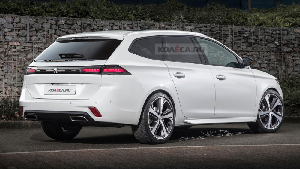 Сбоку можно выделить горизонтальную выштамповку, проходящую от фар до фонарей и «исчезающую» в районе центральной стойки. Подоконная линия расположится выше по сравнению с нынешним 308-м. Сзади можно ожидать появление ещё одного фирменного элемента внешности новинок бренда – фонарей, визуально объединённых с помощью контрастной декоративной вставки. Правда, в отличие от других моделей Пежо, фонари получат горизонтальные светодиодные элементы вместо вертикальных. Судя по шпионским фотографиям, универсал получит увеличенную колёсную базу, подобно нынешней модели, показатель которой выше на 110 мм по сравнению с хэтчбеком (2730 против 2620 мм).