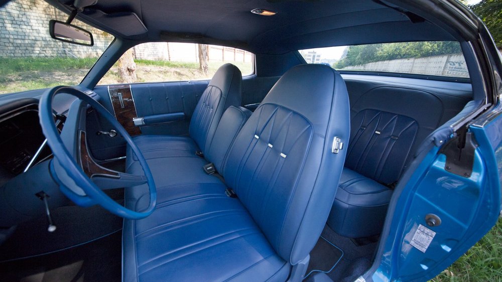Когда петли скрипнули, и массивная створка захлопнулась за моей спиной, я сразу почувствовал себя лучше. Подкупало качественно оформленное внутреннее пространство Fury. Истинный ретро-дизайн, выдержанный в каждой мелочи. Всякая видимая часть салона, будь то торпедо, стенки либо рулевое колесо, была задрапирована небесно-голубой экокожей. Кое-где на глаза попадаются деревянные вставки. «Это шпон американского ореха, – поясняет Ростислав. — В оригинале здесь значились бумажные принты с этим рисунком, но мы решили заказать в Штатах панели из настоящего дерева. Так оно правильнее выглядит».