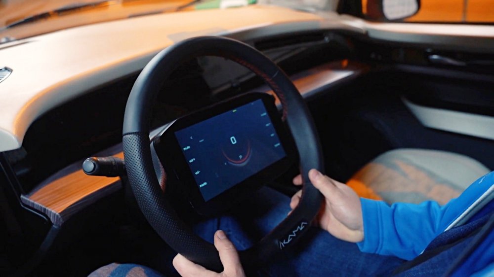 Самая запоминающаяся деталь салона — руль с зафиксированной ступицей, на которой закреплён 9-дюймовый сенсорный экран, заведующий всеми основными настройками электромобиля. Роль щитка приборов выполняет проекционный экран на лобовом стекле. Водительская подушка безопасности при аварии выстреливает из потолка.