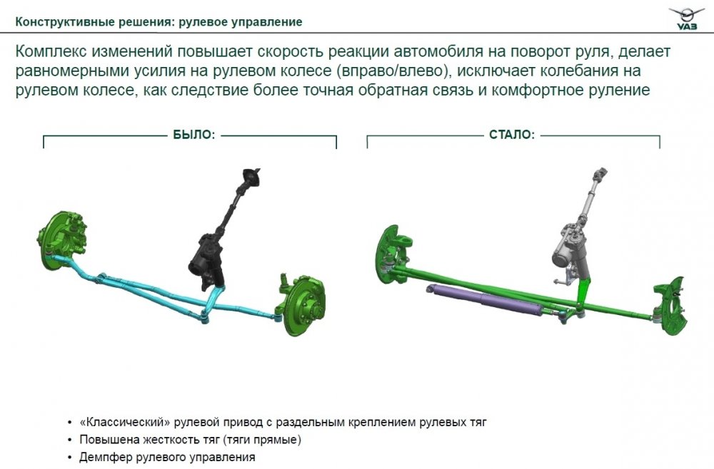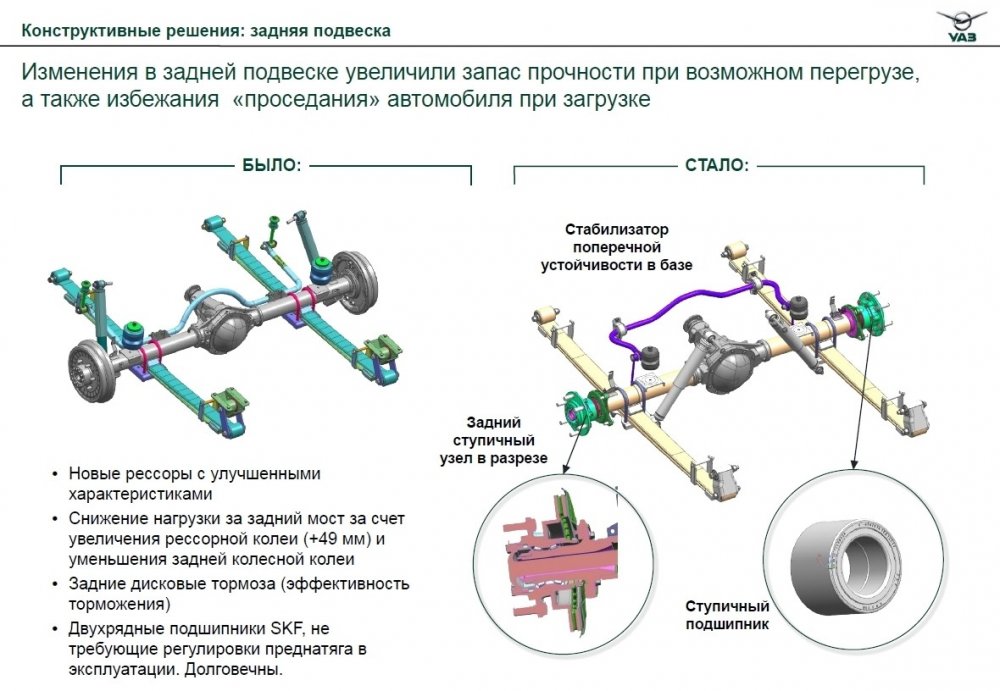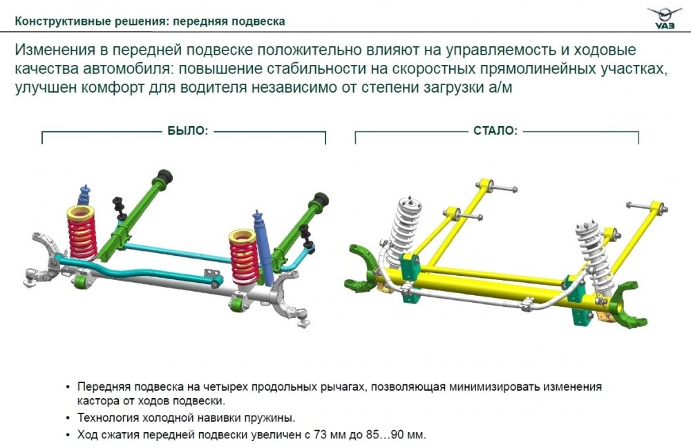Предполагается, что изменения в ходовой части заметно улучшат управляемость коммерческого «уазика» и сделают его эксплуатацию менее изнурительной для водителя. Для его же удобства теперь в виде опции предлагается более комфортное кресло от Патриота с более длинной подушкой и регулировкой поясничного подпора. Вместе с этим креслом в пакет «Комфорт» входят кондиционер с охлаждаемым перчаточным ящиком, круиз-контроль, подогрев лобового стекла и сидений.