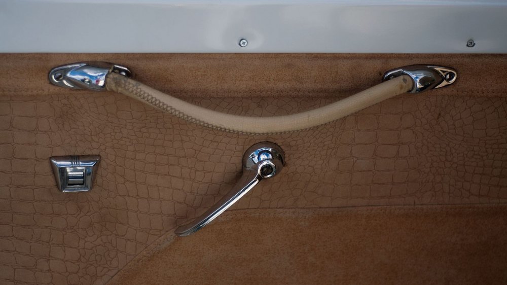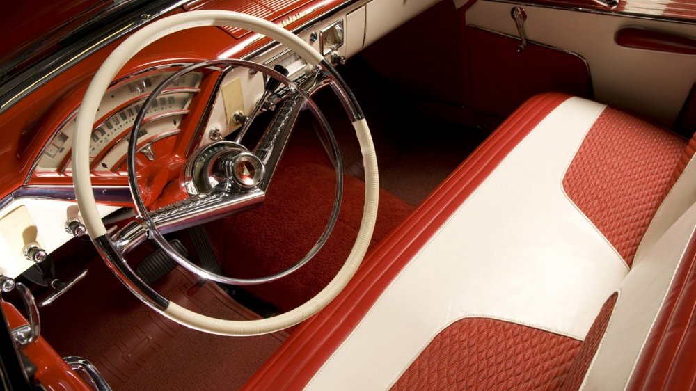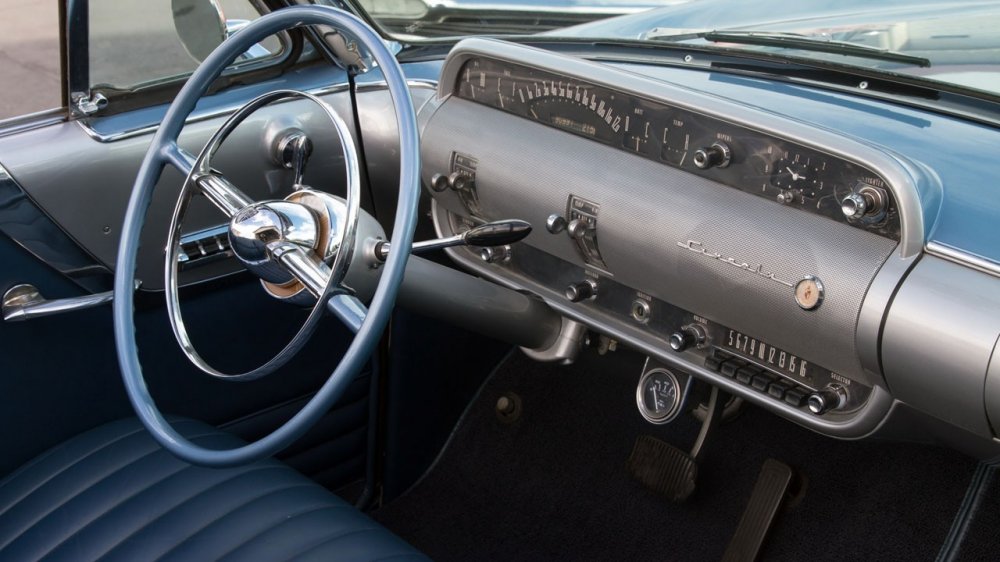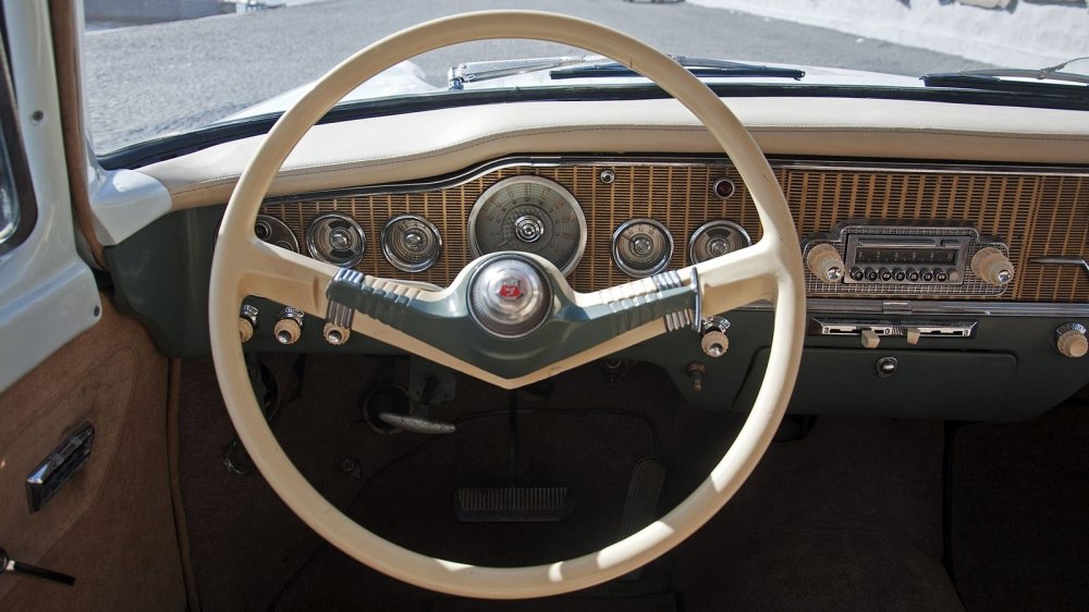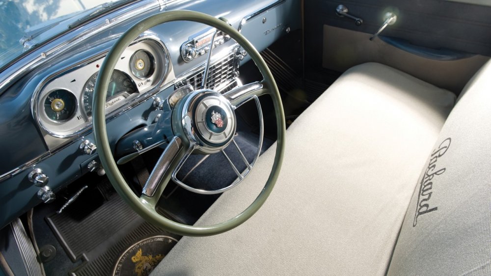Внутри Чайки опять возникает ощущение, что я это всё уже много раз видел. Вот, например, спидометр и часы, разнесённые на разные стороны панели (спидометр стоит перед глазами водителя, часы – пассажира). Это типично американский ход. Такое было у них ещё до эпохи Чайки. Например, на Packard Eight 1937 года, хотя и для конца 50-х такое расположение этих приборов считалось классическим.