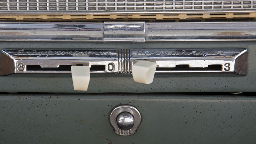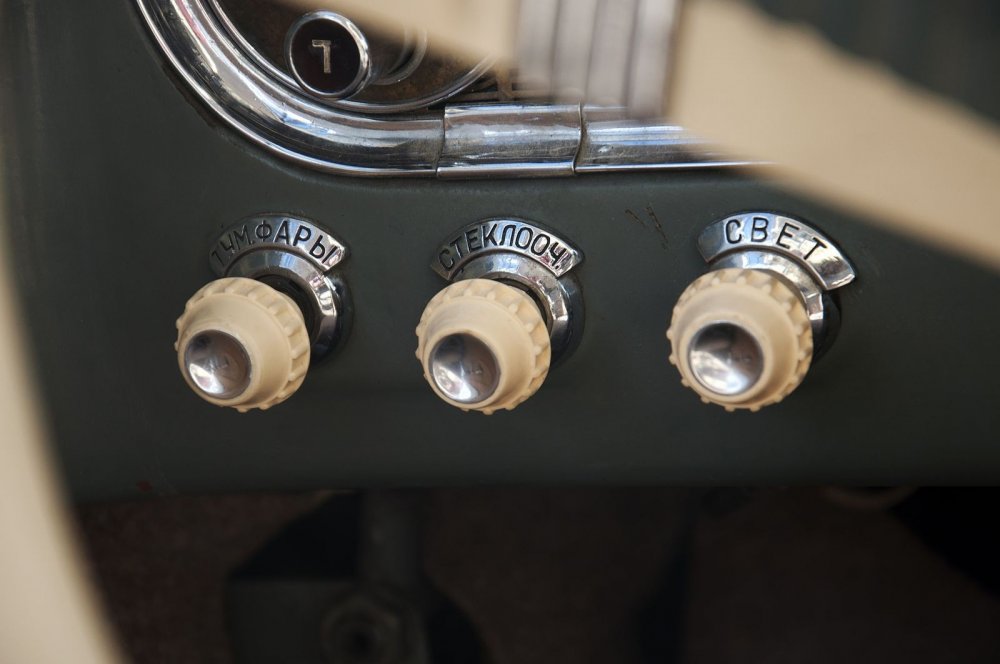 Селектора АКП в ГАЗ-13 нет. Есть четыре кнопки слева от рулевой колонки. Вот тут хотелось бы иметь надписи, но есть только буквы Н, Д, Т и ЗХ. Н – это нейтраль, Д – движение (а не drive, как кто-то мог подумать), ЗХ – задний ход. А вот Т – не совсем понятно. Логично, что это мог бы быть тормоз (что-то типа паркинга), но нет. Т – это торможение. В этом режиме не включается третья передача, и в нём хорошо тормозить мотором. К сожалению, кое-что в этих кнопках работает не так, как надо, поэтому режим движения надо включать с небольшим танцем с бубном: нажимаем Т, ждём небольшого точка и сразу нажимаем Д. Машина поехала – прекрасно. Нет – повторяем операцию. В целом машина ехала почти всегда сразу, как положено.