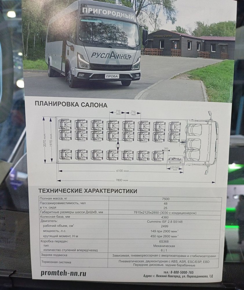 Еще один отечественный боец на ниве китайских комплектующих и собственной смекалки – нижегородская компания «Промтех». На выставке она показала уже почти серийный образец своего «пригорода» II класса по имени Руслайнер (будет еще люксовый «пригород», «город» пока не рассматривается). «Почти» – потому что автобус наверняка претерпит определённые изменения по итогам коммуникации с потенциальными потребителями. Но в общем и целом формат уже определён, а приём заказов открыт.