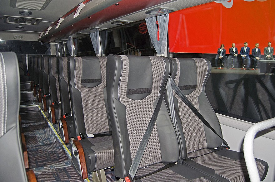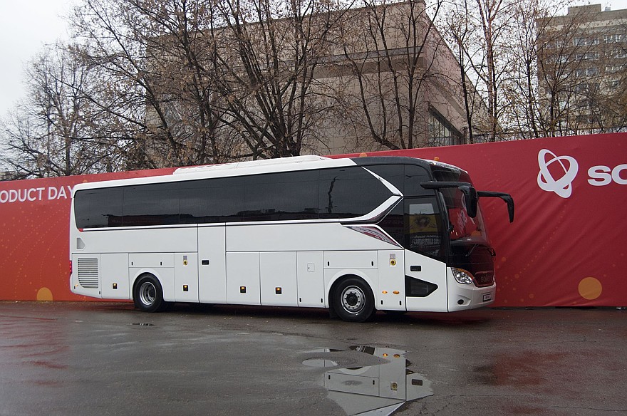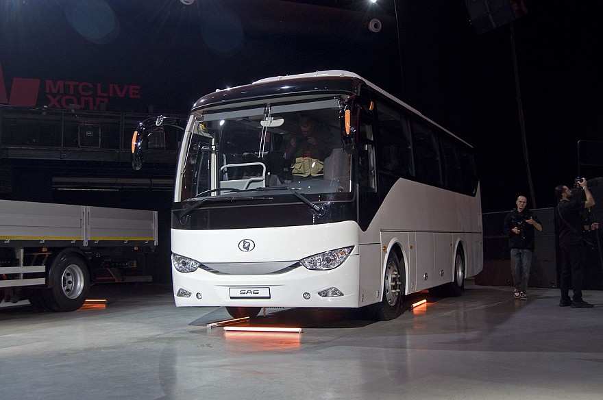 Теперь перейдём к автобусам. Их презентовали сразу целой линейкой: междугородние автобусы SA6 и SA9, городской автобус SE9 и школьный автобус, индекс модели которого нам почему-то не назвали. Интересно, что SE9 может быть как дизельным, так и электрическим. Именно электробус и привезли на выставку. Запас хода обещают в 250 км. Первые два автобуса могут появиться на улицах наших городов уже в первом квартале следующего года, сроков начала продаж городского и школьного автобуса пока не называют.