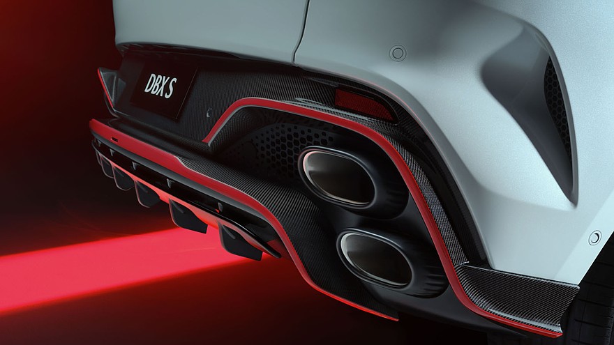У «эски» есть несколько визуальных отличий от «обычного» кроссовера. Новая топ-версия получила более агрессивный сплиттер, а корму снабдили другим диффузором, кроме того, у Aston Martin DBX S иная компоновка выхлопной системы: двойные патрубки расположены вертикально с каждой стороны. Ещё нельзя не заметить контрастные красные акценты по периметру нижней части кузова SUV.