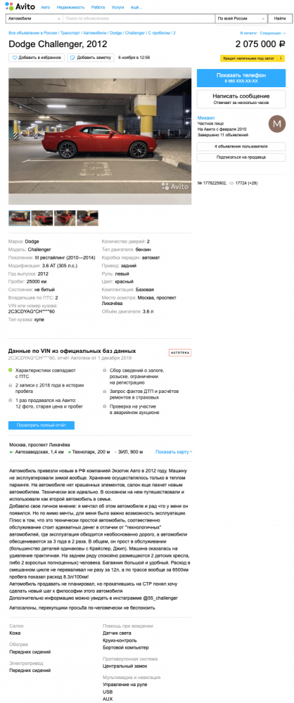 Почти год назад мы размышляли над покупкой свежего Ford Mustang и пришли к выводу, что, несмотря на неплохую внешность, 4 цилиндра под капотом многих могут разочаровать, а 8 обходятся слишком дорого. Chevrolet Camaro, как известно, тоже получил четырехцилиндровый турбомотор в качестве базового. На этом фоне Dodge Challenger кажется последним оплотом «настоящей мускулистой Америки», причем он более выразителен не только благодаря могучим атмосферным двигателям. Наши коллеги из Авито Авто говорят, что машин в продаже достаточно для того, чтобы выбирать, а цены на растаможенные варианты с местной регистрацией начинаются примерно с 1,5 миллионов. И даже с учетом того, что верхняя граница цены предсказуемо уходит за облака, уже за 2 миллиона или чуть больше есть шансы найти ухоженную машину. Чем придется поступиться и с чем столкнуться при покупке?