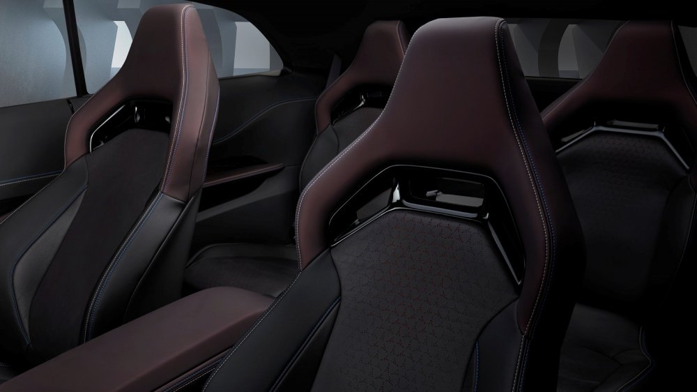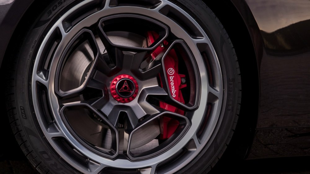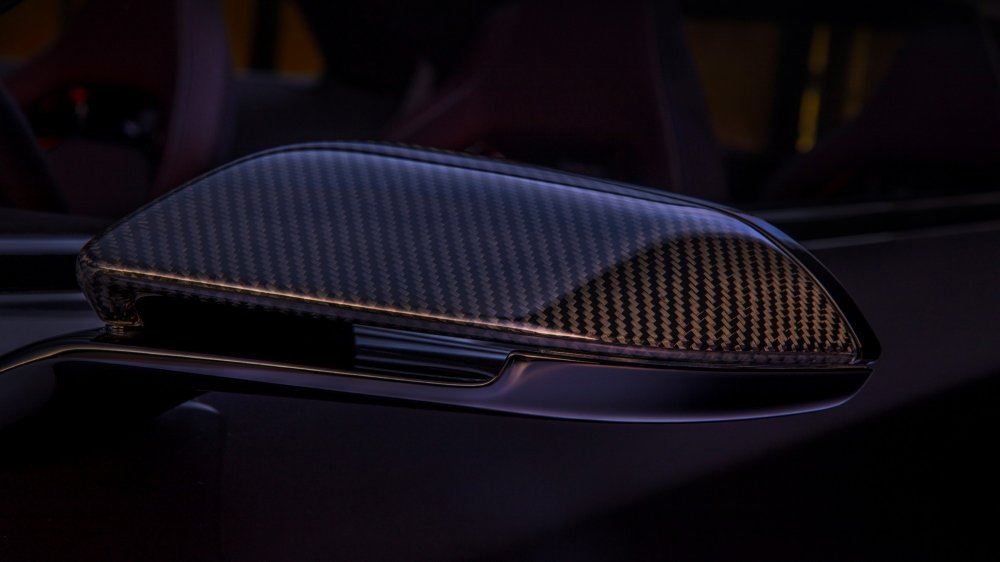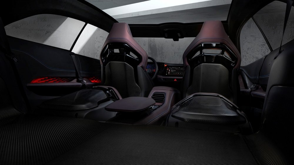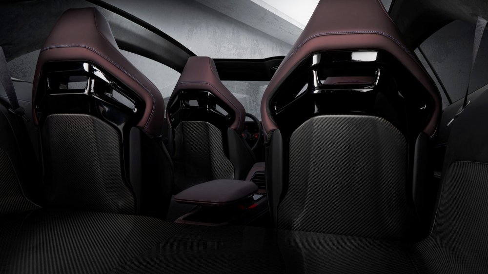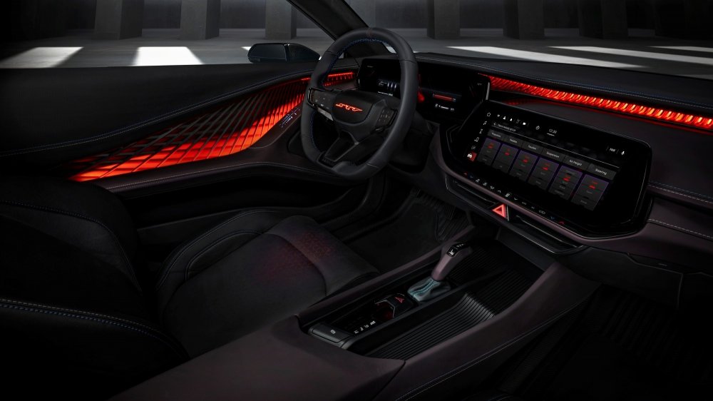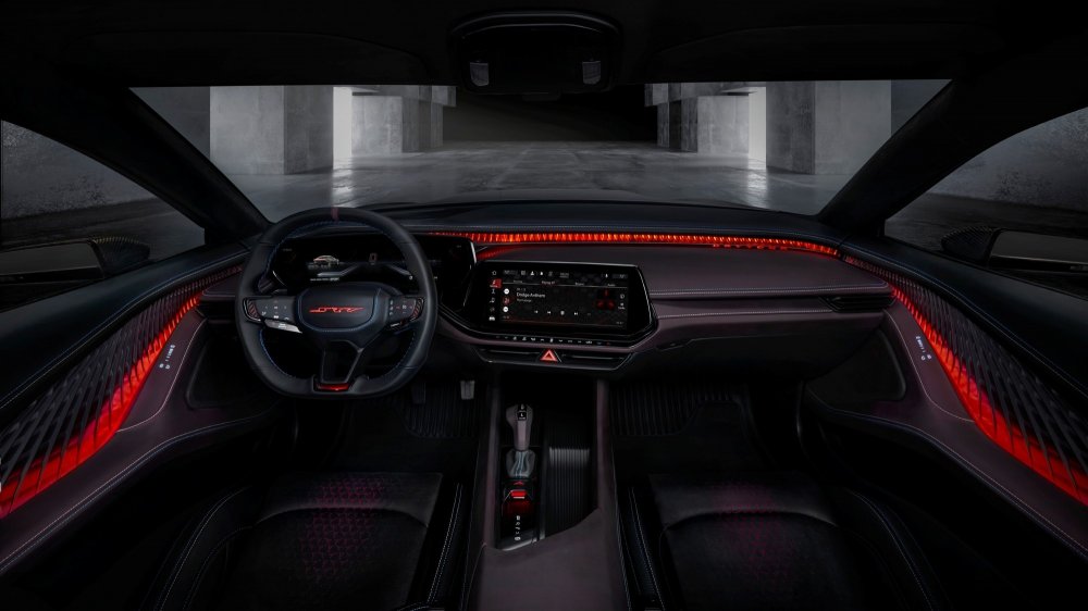 В салоне, накрытом панорамной прозрачной крышей, четыре индивидуальных кресла с интегральными подголовниками и карбоновым декором. Передняя панель с драматичным светодиодным контуром имеет центральный 12,3-дюймовый мультимедийный экран и огромный 16-дюймовый изогнутый виртуальный щиток приборов, дополненный проекционным экраном шириной 8 дюймов. Большинство физических кнопок заменены сенсорными панели, но центральный тоннель выглядит довольно старомодно: селектор трансмиссии в форме рукоятки пистолета отсылает к классическим спорткарам Dodge, а рядом под крышкой находится красная кнопка запуска силовой установки.