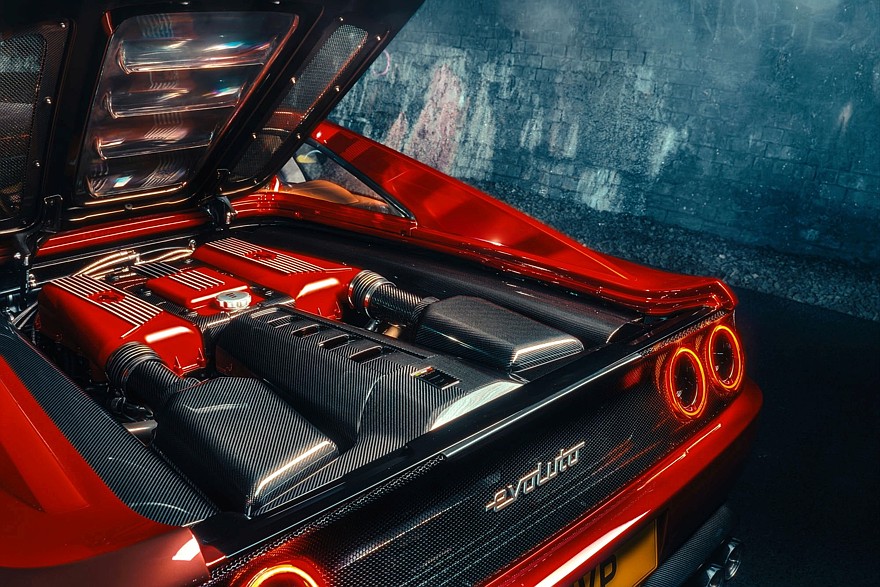 Для изготовления каждого 355 by Evoluto нужен хорошо сохранившийся донорский Ferrari F355 GTS, от которого в ход пойдут только остов кузова и 3,5-литровый атмосферный двигатель V8. Силовой каркас тщательно реставрируется и получает усилители из стали и углепластика, жёсткость на кручение в результате увеличивается на 23%. Все наружные панели новые, углепластиковые, при этом сохранены ключевые стилистические особенности исходного итальянского спорткара, в том числе поднимающиеся фары. Стоковая проводка на 90% заменена новой, более компактной и лёгкой. Система микроклимата модернизирована.