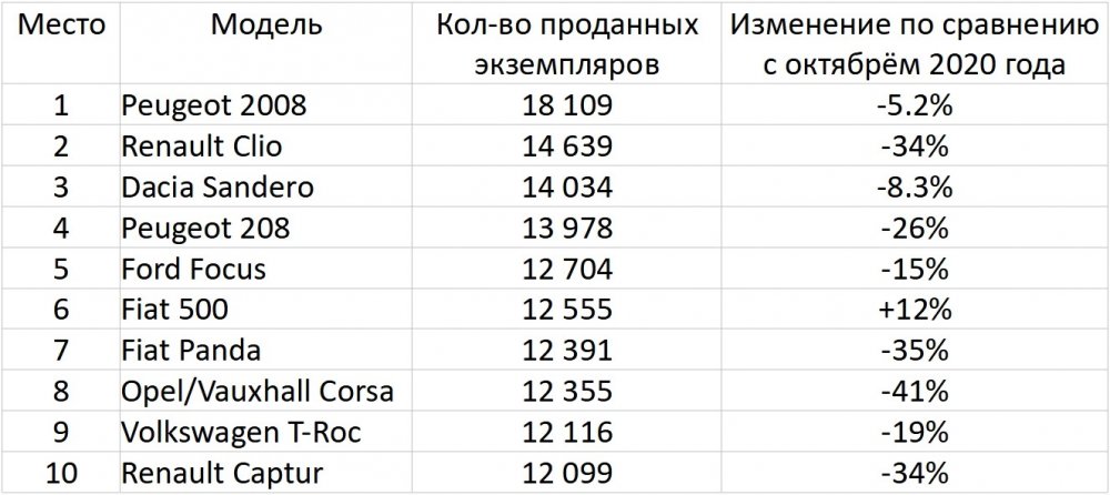 Обратите внимание также, что дефицит микрочипов вернул в список европейских бестселлеров казалось бы давно списанный со счетов Ford Focus — эта модель аккурат в октябре пережила рестайлинг.