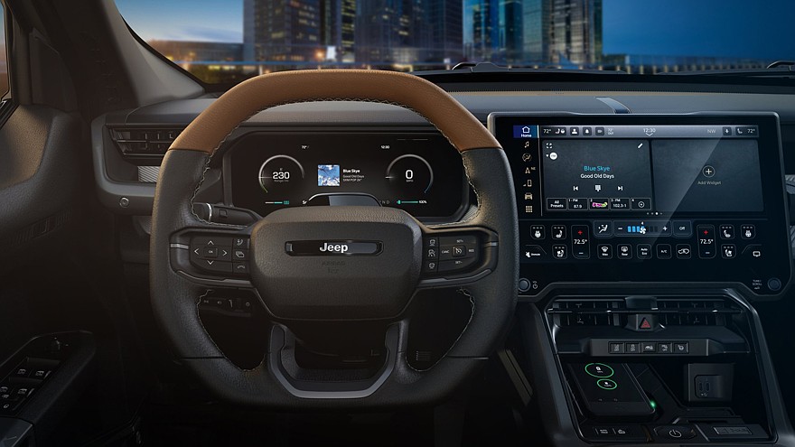 У электромобиля, рассчитанного на пятерых седоков, на передней панели расположен виртуальный щиток приборов диагональю 12,3 дюйма, а по центру установлен планшет информационно-развлекательной системы Uconnect 5, его диагональ равна 14,5 дюйма. Ниже можно увидеть устройство для беспроводной зарядки смартфонов.