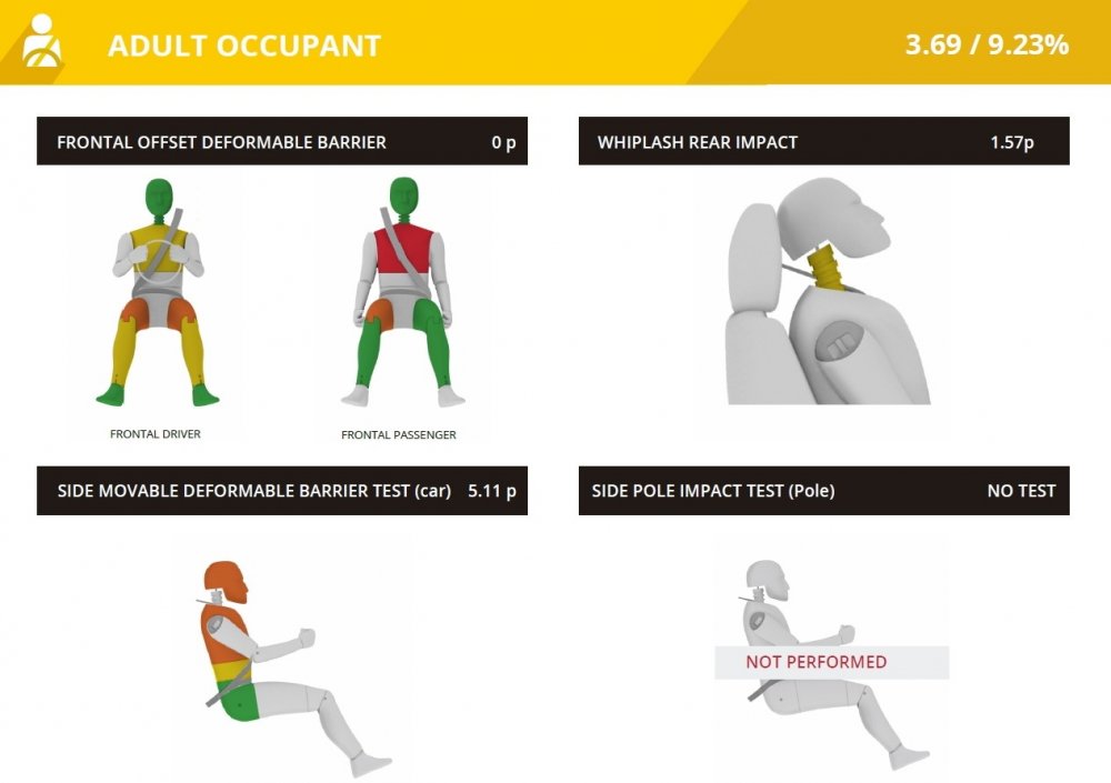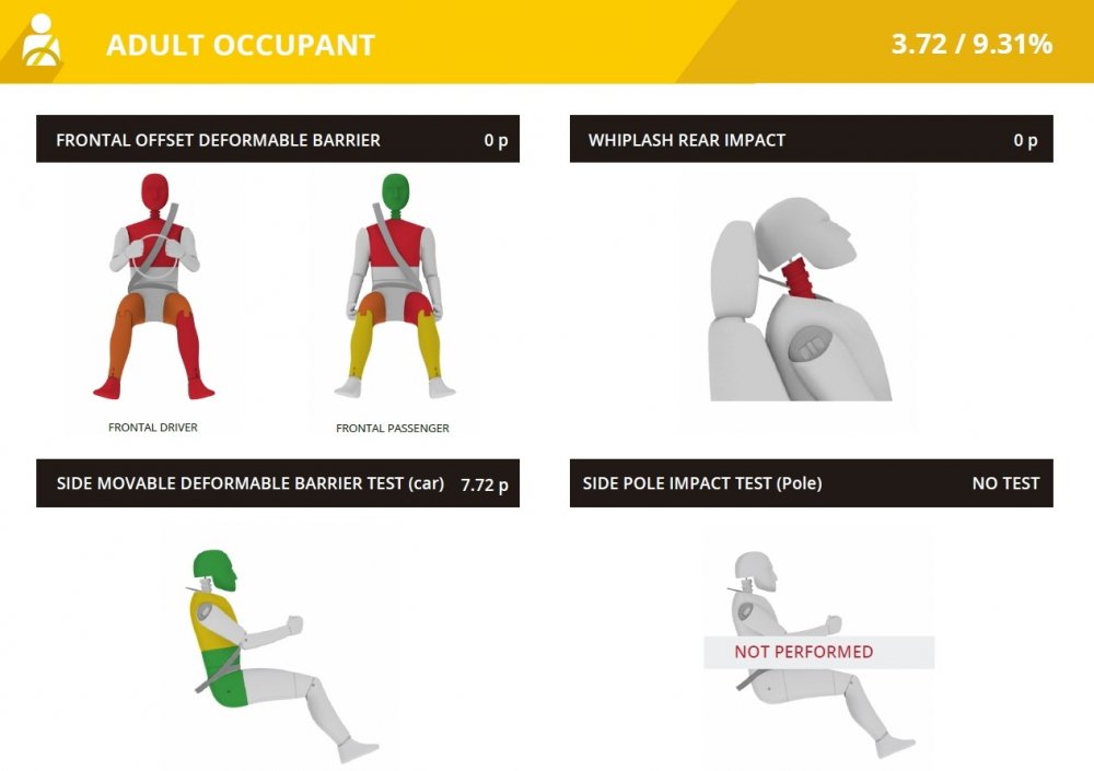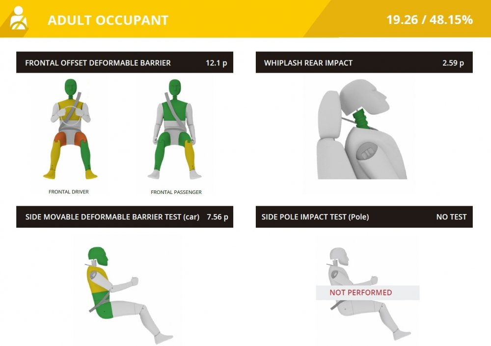 Результат фронтального краш-теста китайского пикапа — катастрофический: нестабильный кузов «поплыл», голова, грудь, голени и ступни водителя подвержены максимальной, смертельной опасности (красный цвет). Грудь, левое бедро и левое колено переднего пассажира также пришлось окрасить в протоколе в красный цвет из-за смертельно опасных перегрузок и риска получения тяжелейших травм. Защита от хлыстовых травм признана неудовлетворительной — очень плохие подголовники.