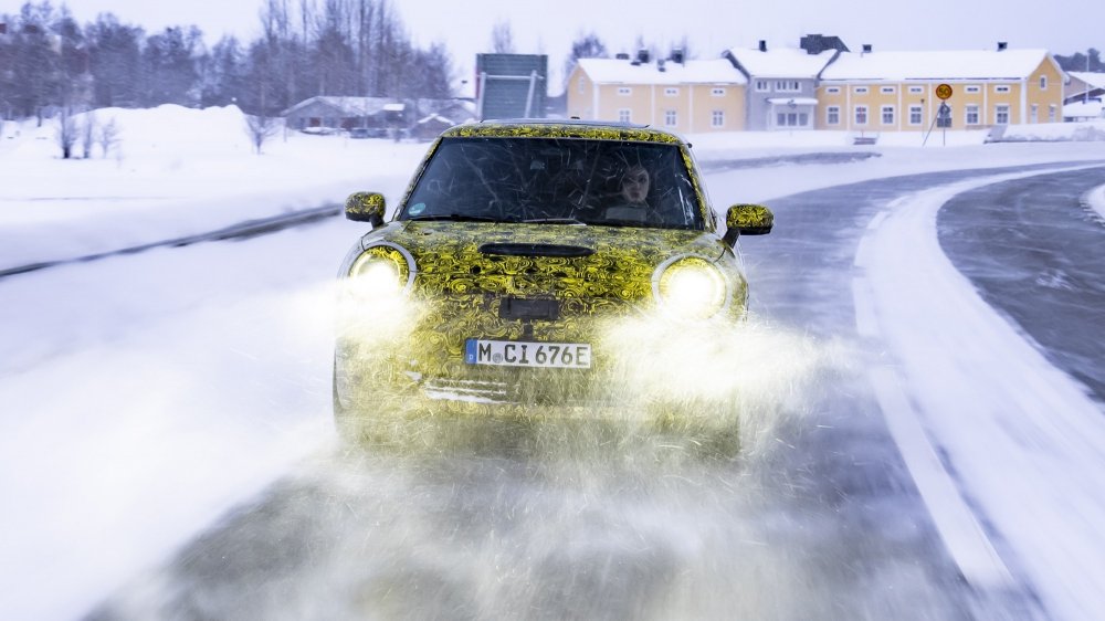 Первые официальные снимки закамуфлированных прототипов нового Mini были опубликованы в ноябре прошлого года, а в декабре в Сеть утекли сделанные в Китае фотографии хэтчбека без маскировочной обёртки, так что внешность, по сути, больше не секрет, но в Швеции машины следующего поколения по-прежнему бороздят снежные просторы в пёстрых разводах (на сей раз в жёлтых) и с обманной «оптикой». Круглые фары кажутся больше, чем есть на самом деле, из-за фальшивых внешних ободков, а задние фонари прикидываются овальными, хотя на самом деле они треугольные, со светодиодной сеткой в в стиле Человека-паука.