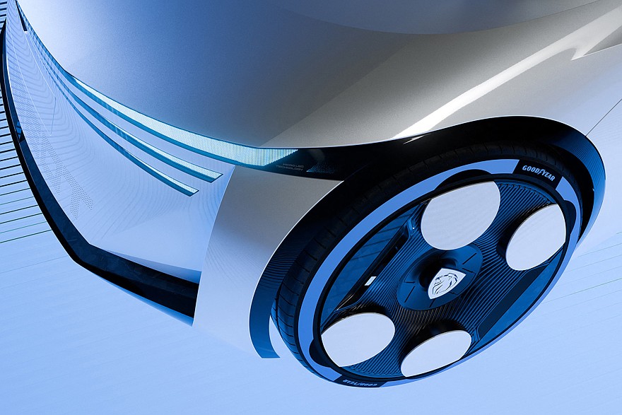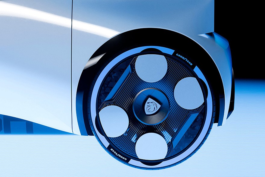 На корме можно увидеть полукруглый чёрный элемент с названием шоу-кара, а под линией остекления – «монофонарь» со световым рисунком, состоящим из разных штрихов и названия марки. Ещё Peugeot Polygon получил необычные колёсные диски, обутые в низкопрофильные шины фирмы Goodyear с синим ободом.