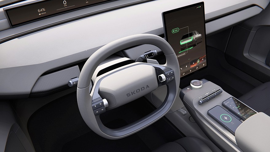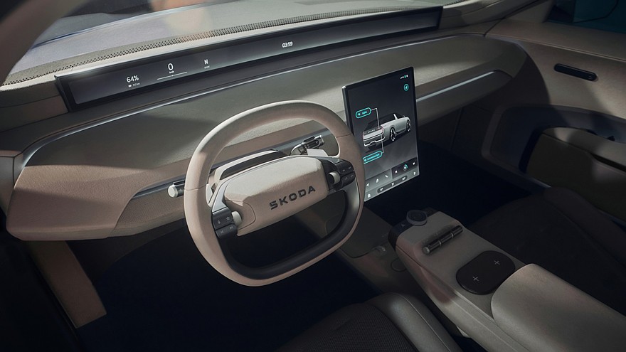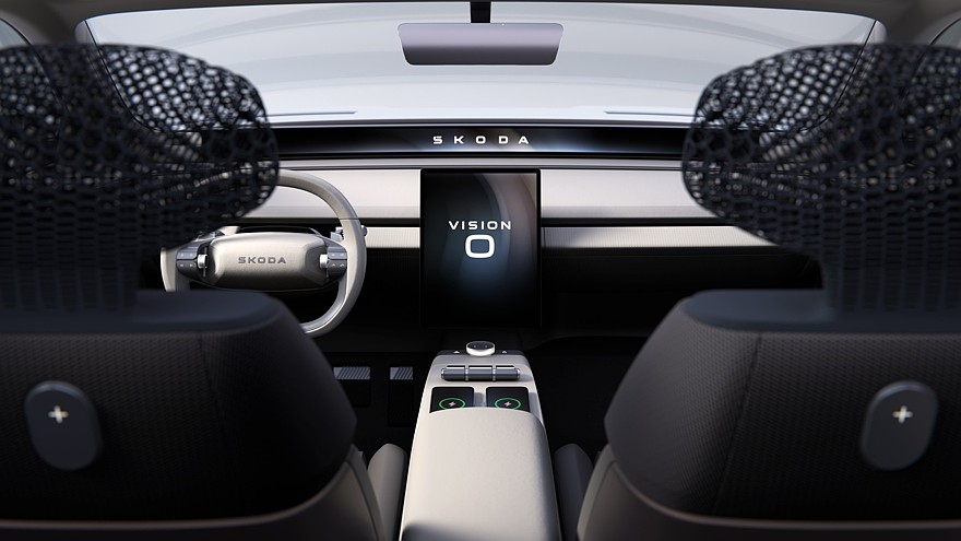Салон Skoda Vision O имеет типично концептуальные кресла с ажурными, напечатанными на 3D-принтере подголовниками (напоминают затвердевшую авоську), отсутствие центральный стоек — это тоже коцептуальная блажь, а вот передняя панель выглядит вполне готовой к производству, то есть тщательно продуманной. Роль приборного щитка выполняет отнесённая к лобовому стеклу узкая экранная полоса шириной 1,2 м, а к центру передней панели прикручен мультимедийно-настроечный планшет с голосовой помощницей по имени Лаура. На руле и центральной консоли имеются физические клавиши и рукоятки, в том числе для основных настроек микроклимата. Объём багажника — более 650 л, со сложенными спинками заднего дивана — более 1700 л. В число практичных удобств, которыми славится Skoda, входят четыре зонтика в специальных нишах, бортовой холодильник и съёмная Bluetooth-колонка.