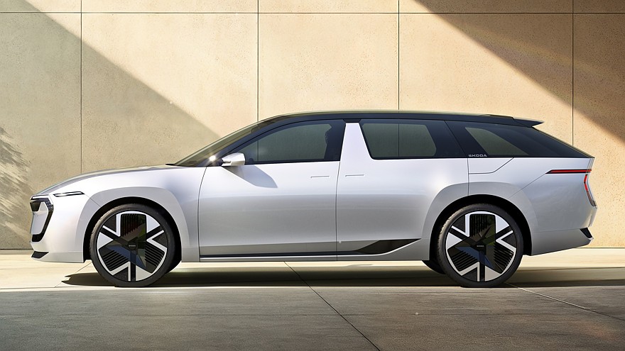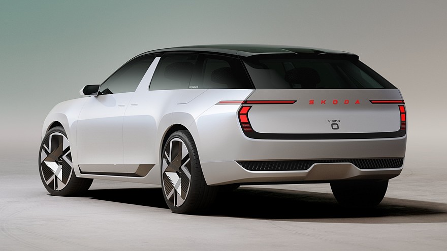 В том же заострённо-угловатом ключе выполнена и корма с Т-образными светодиодными фонарями. Оквадраченные выштамповки вокруг колёсных арок усиливают эффект мускулистости, притом что крылья у универсала сами по себе довольно широкие. В целом в кои-то веки у массового электромобиля получились правильные, визуально нетяжёлые пропорции. Габаритная длина Skoda Vision O — 4850 мм, ширина — 1900 мм, высота — 1500 мм.