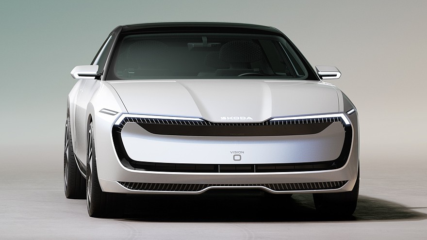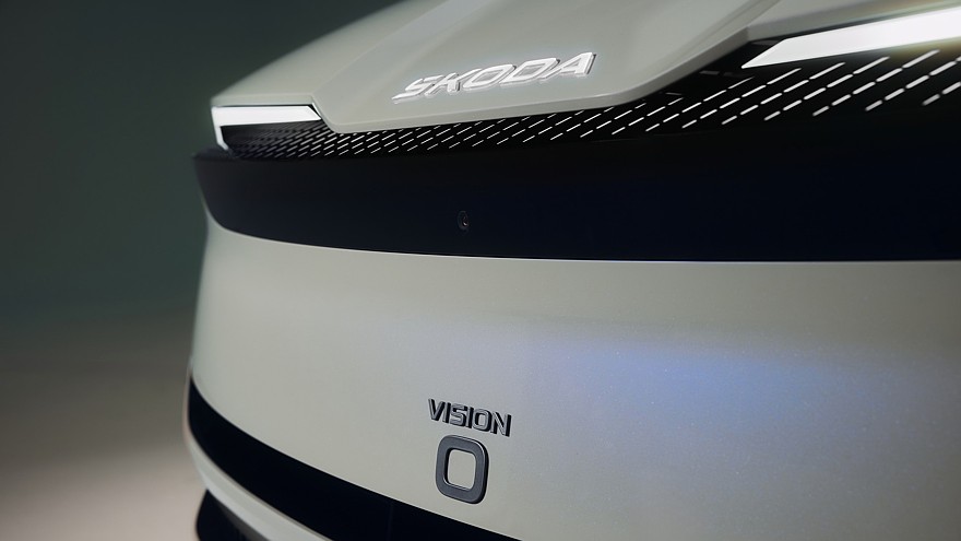 Нынешний стиль Skoda называется Modern Solid, но в концепте Vision O мы видим его новое прочтение, более агрессивное и c элементами неоклассики. Светодиодная маска Tech-loop вписана в довольно сложный профиль передка со впадиной на уровне центральной горизонтали, из-за которой его верхняя часть напоминает зубило, причём этот эффект усиливает выпирающая вперёд центральная часть кромки капота.