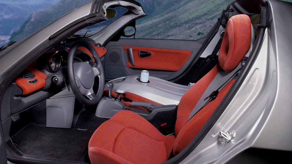 При личном знакомстве с Roadster удивляет не только длина в 3,4 метра, но еще и крайне малая высота – всего 1,2 метра. То есть, рослым людям автомобиль в буквальном смысле оказывается по пояс. Однако специфическая посадка «на полу» с прямыми ногами обеспечивает приличный запас пространства, так что даже если вы выше среднего, бояться нечего. Тем не менее, в целом салон, разумеется, тесноват, а процедура посадки и высадки требует привыкания и здоровых суставов.