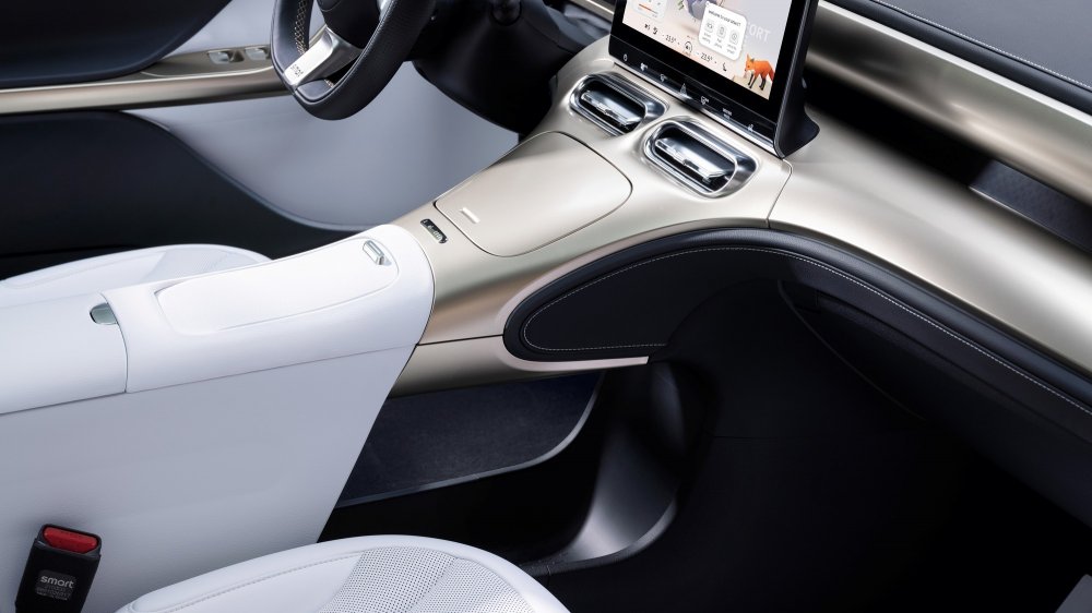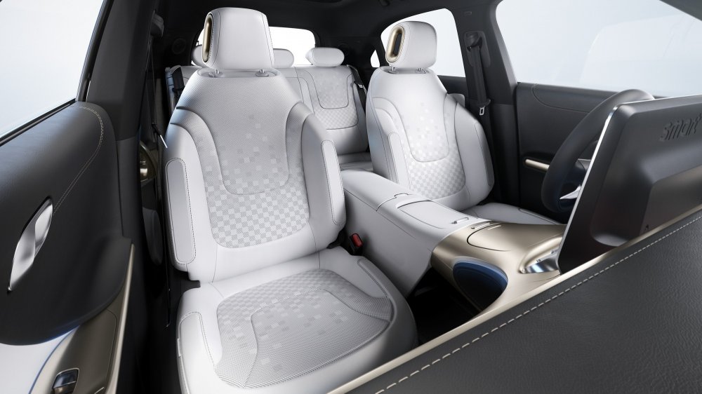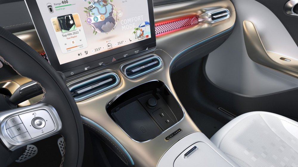 Серийный smart #1 мало чем отличается концепта, а в некоторых интерьерных деталях выглядит даже интереснее — спасибо тщательно подобранным материалам отделки и атмосферной 64-цветной светодиодной подсветке. Минималистичная передняя панель имеет узенький 9,2-дюймовый щиток приборов, который дополнен 10-дюймовым проекционным экраном. Мультимедийный планшет, торчащий из центральной консоли, имеет диагональ 12,8 дюйма и разрешение 1920 х 1080 точек. Сама центральная консоль перетекает в «парящий» центральный тоннель, под которым есть ниша для небольшого рюкзака или сумки.